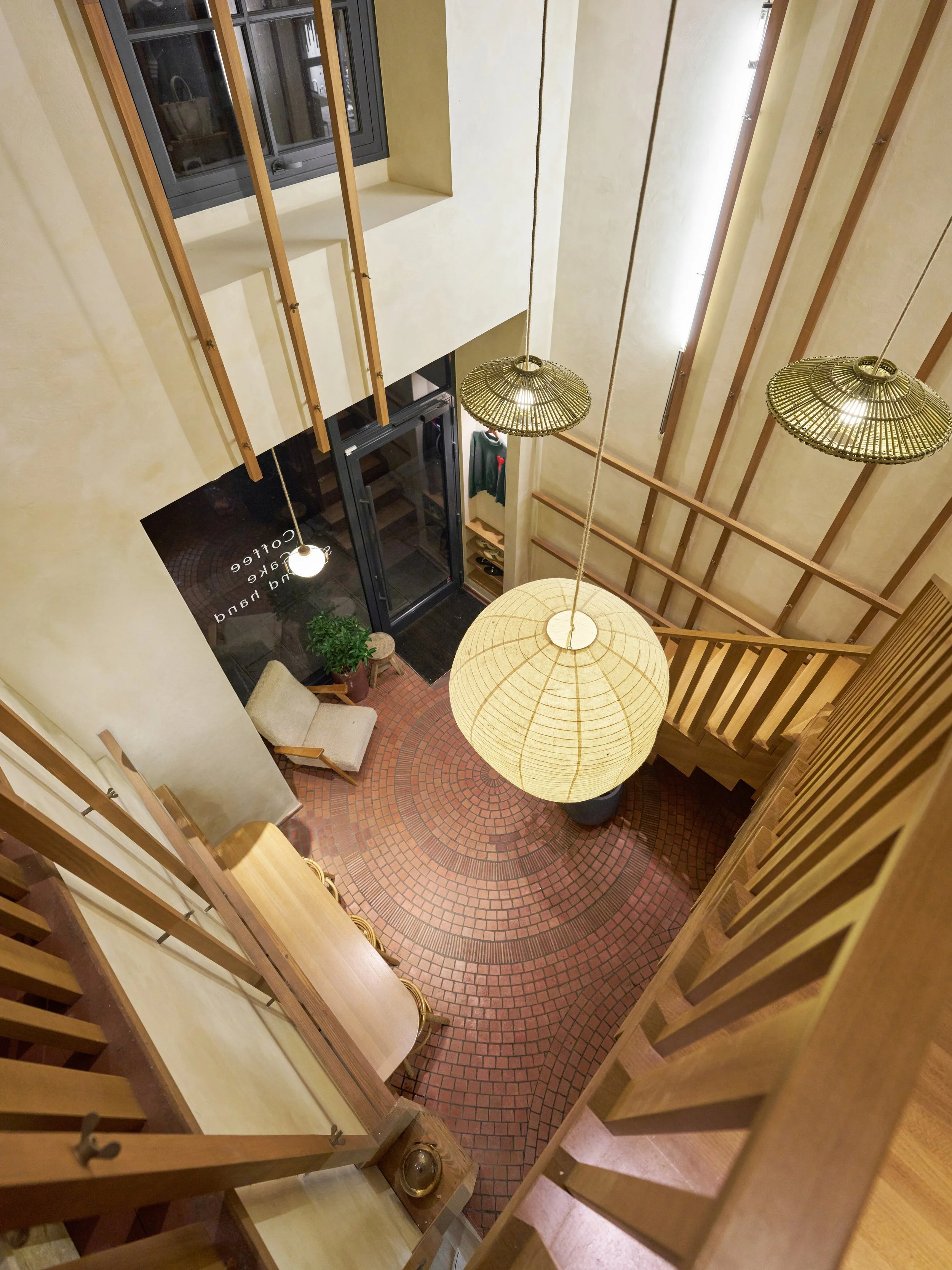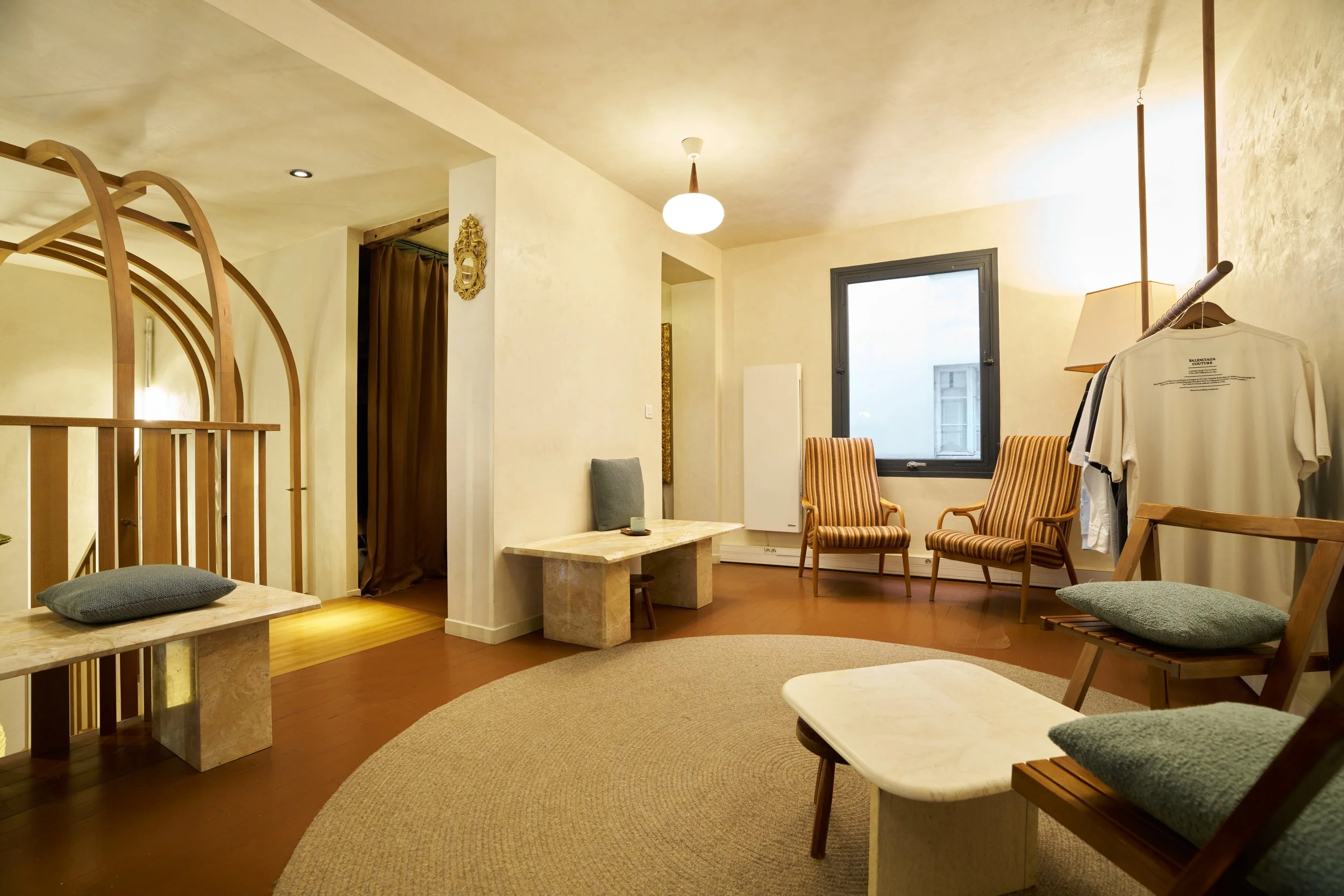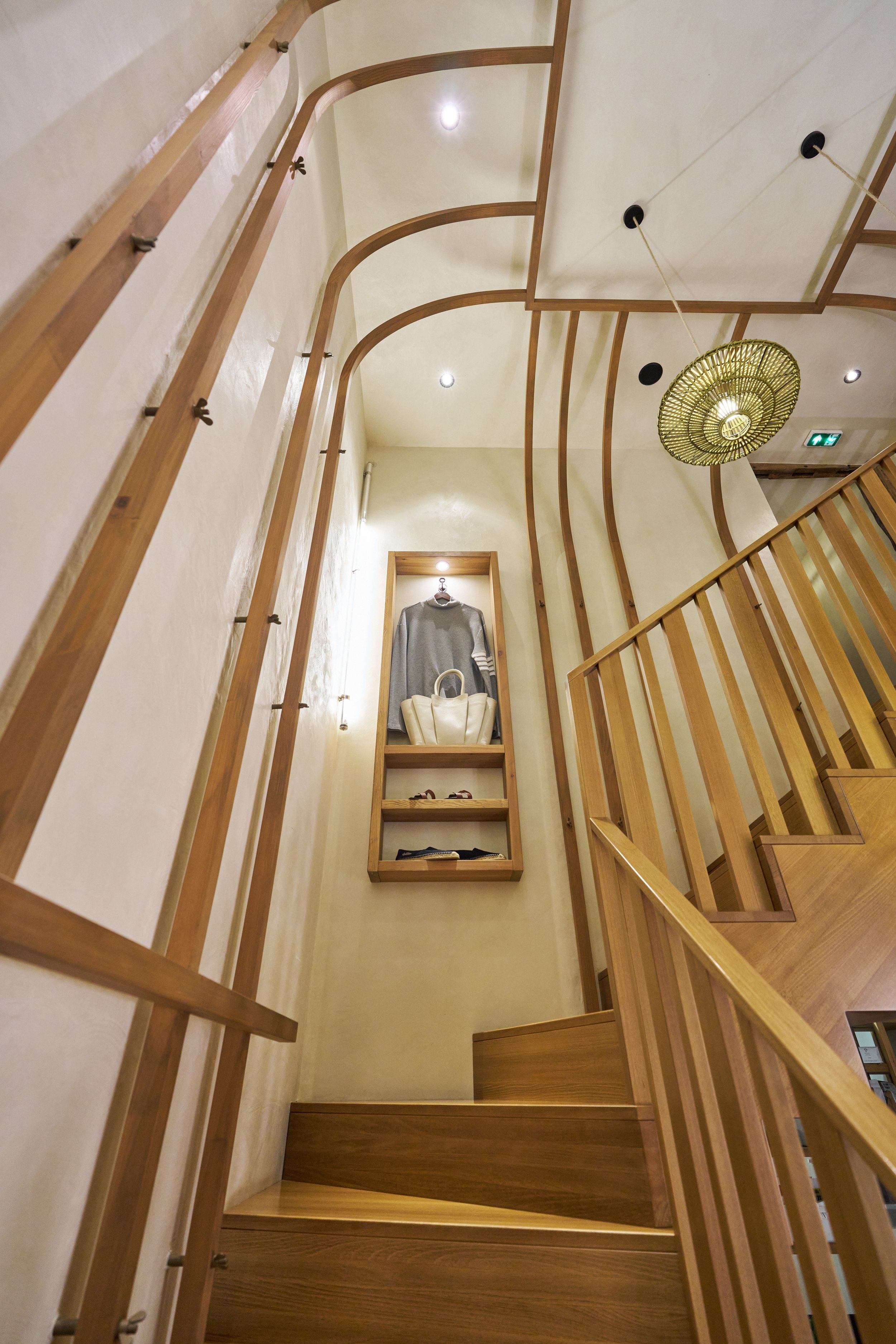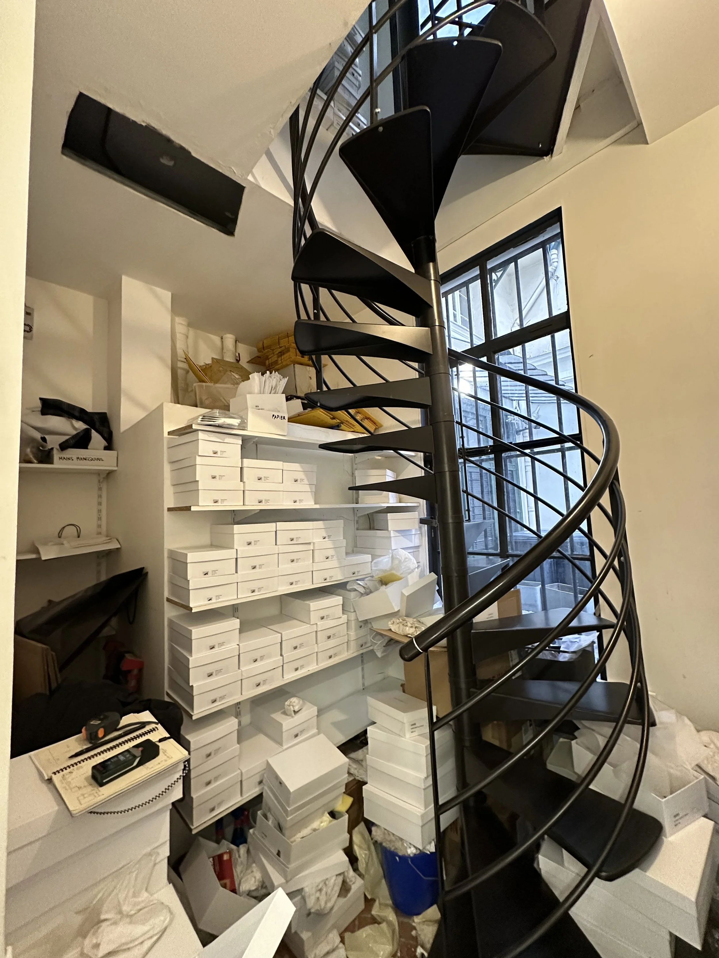 Au rez-de-chaussée, la cloison qui séparait l'espace de vente de l'ancienne réserve a été supprimée, créant un espace ouvert destiné à accueillir un bar et une cuisine. L'ancien escalier en colimaçon, qui menait à l'étage où se trouvait le bureau, a été remplacé par un grand escalier d'angle, conçu comme une sculpture centrale dans l'espace. Cet escalier invite naturellement les clients à monter à l'étage, où se déroulent la dégustation et l'essai des vêtements.