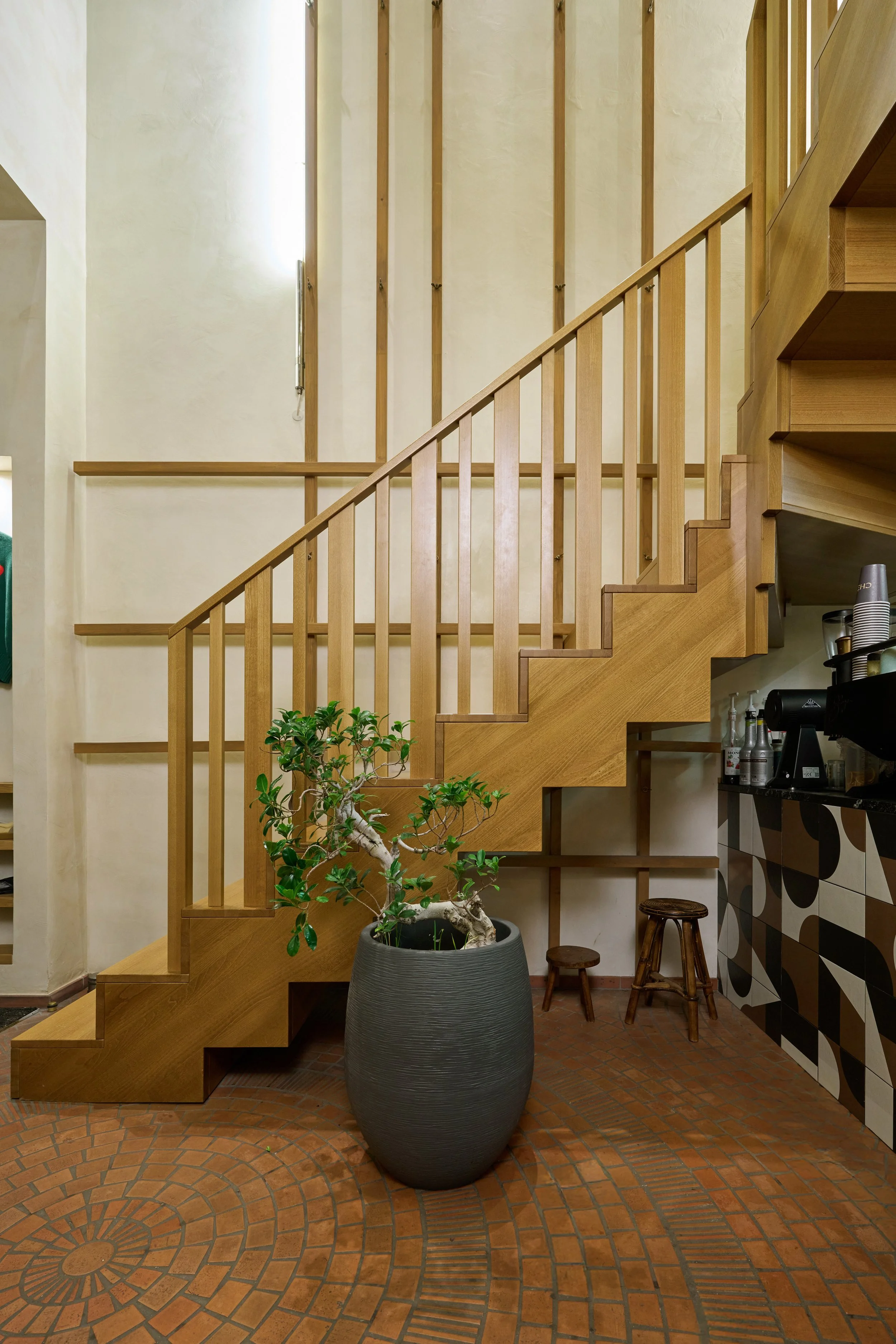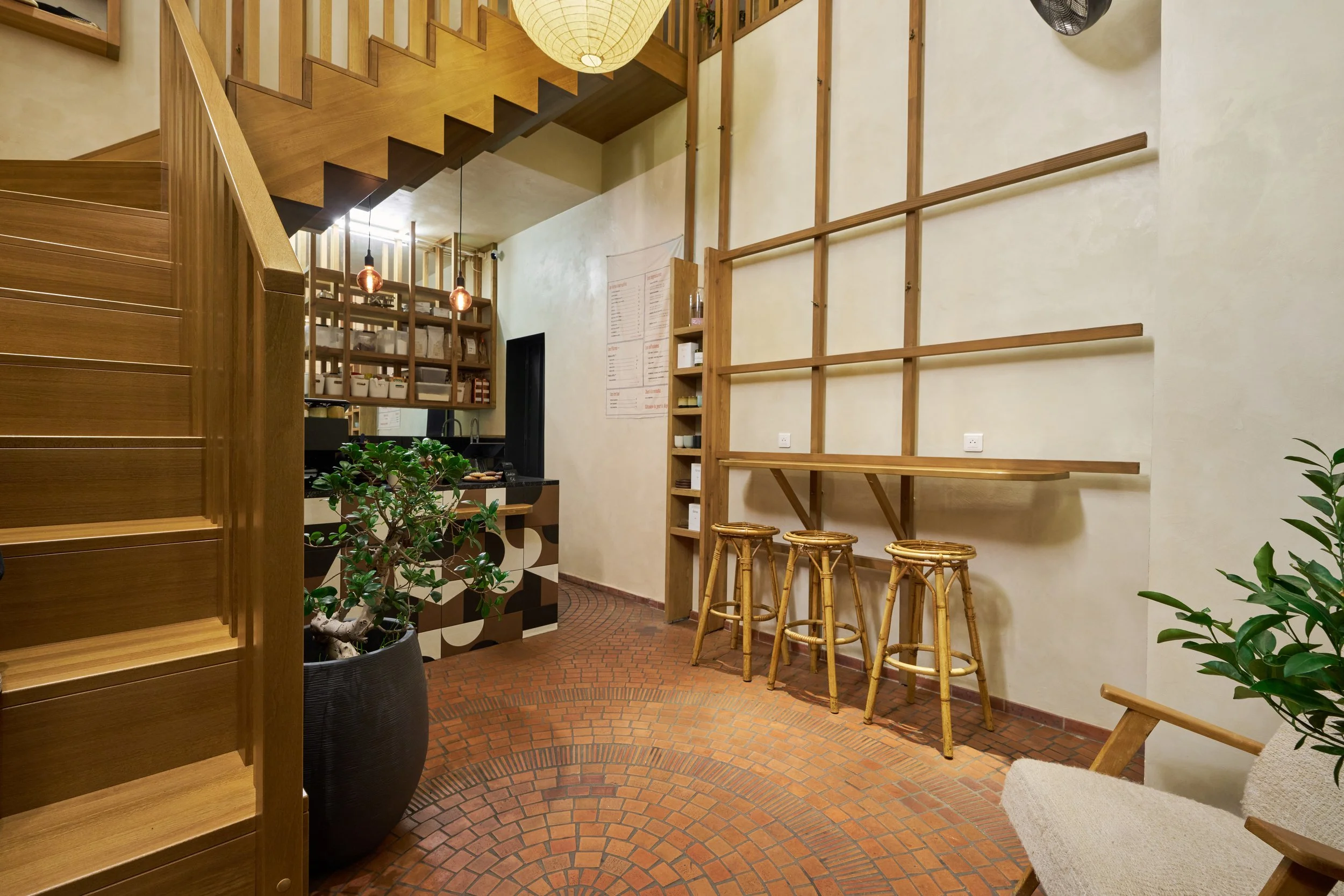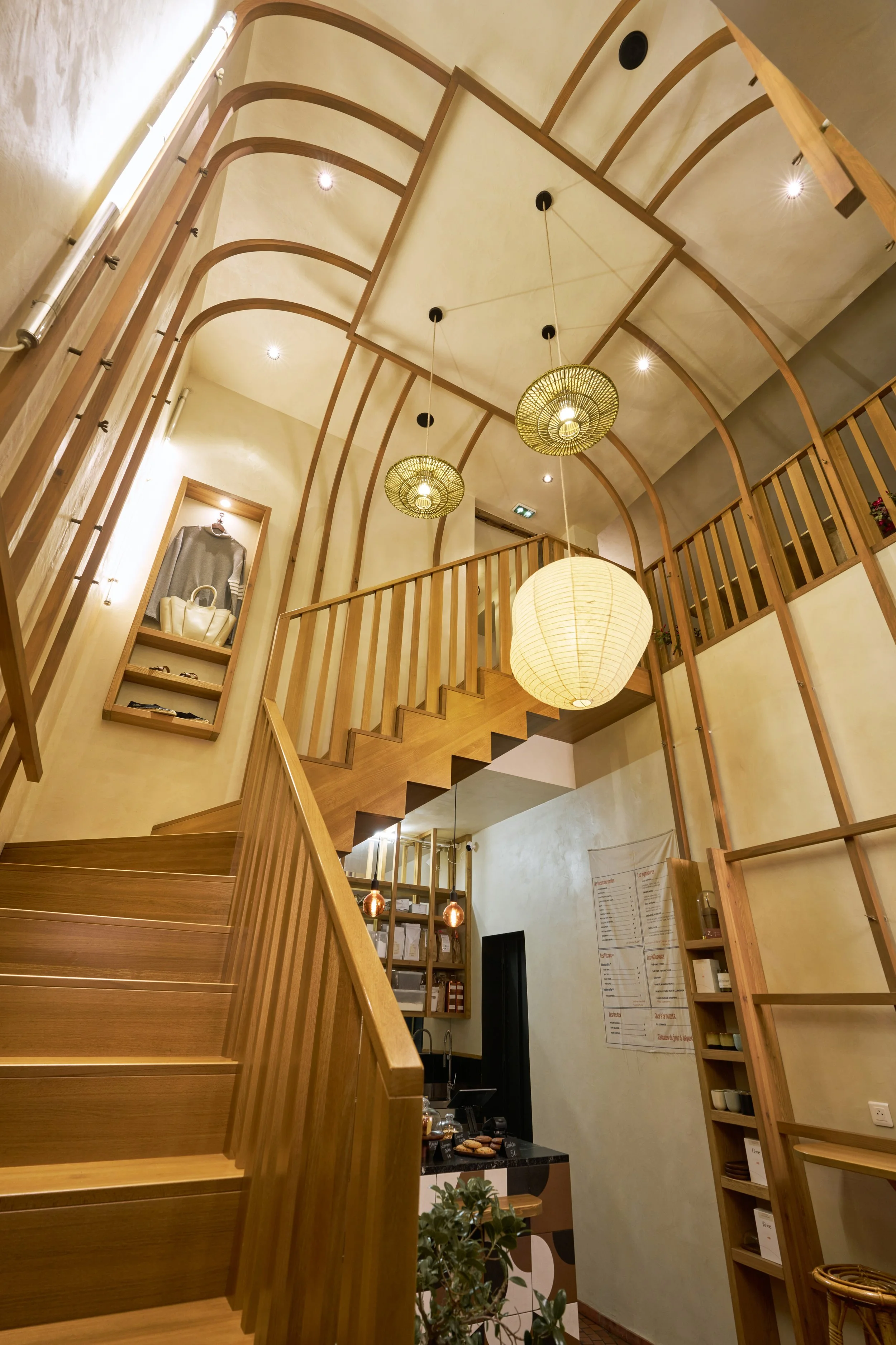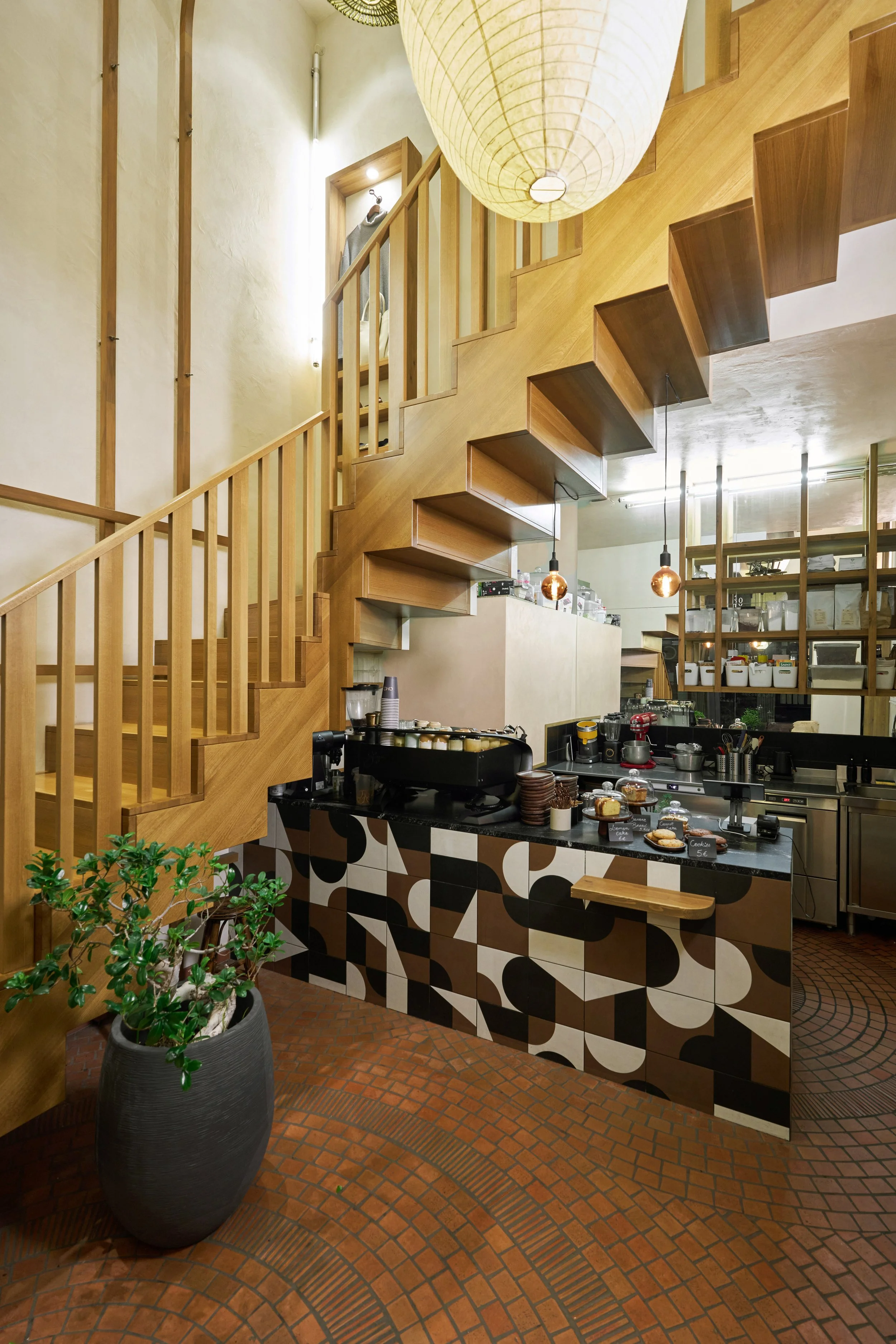 Au rez-de-chaussée, la cloison qui séparait l'espace de vente de l'ancienne réserve a été supprimée, créant un espace ouvert destiné à accueillir un bar et une cuisine. L'ancien escalier en colimaçon, qui menait à l'étage où se trouvait le bureau, a été remplacé par un grand escalier d'angle, conçu comme une sculpture centrale dans l'espace. Cet escalier invite naturellement les clients à monter à l'étage, où se déroulent la dégustation et l'essai des vêtements.