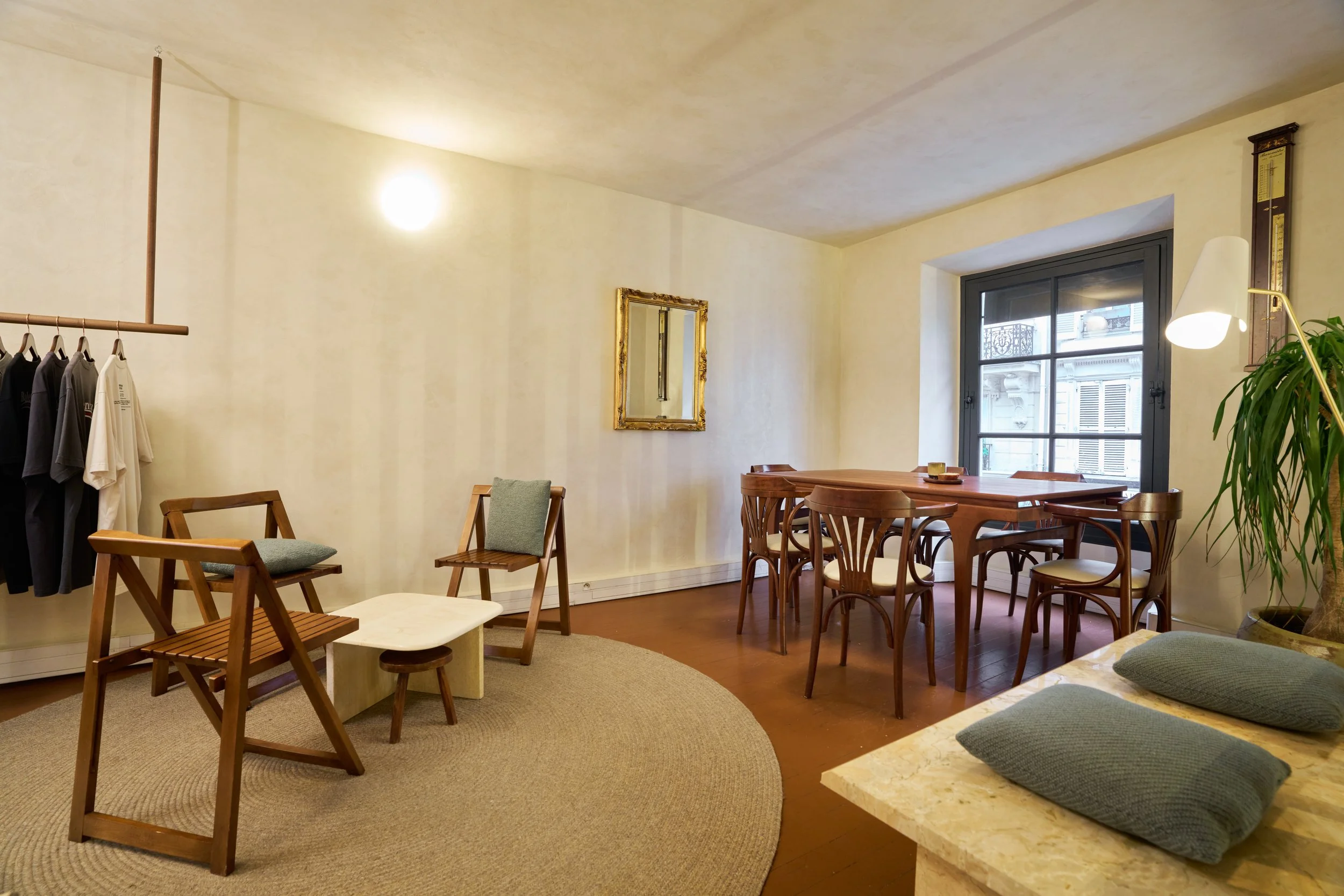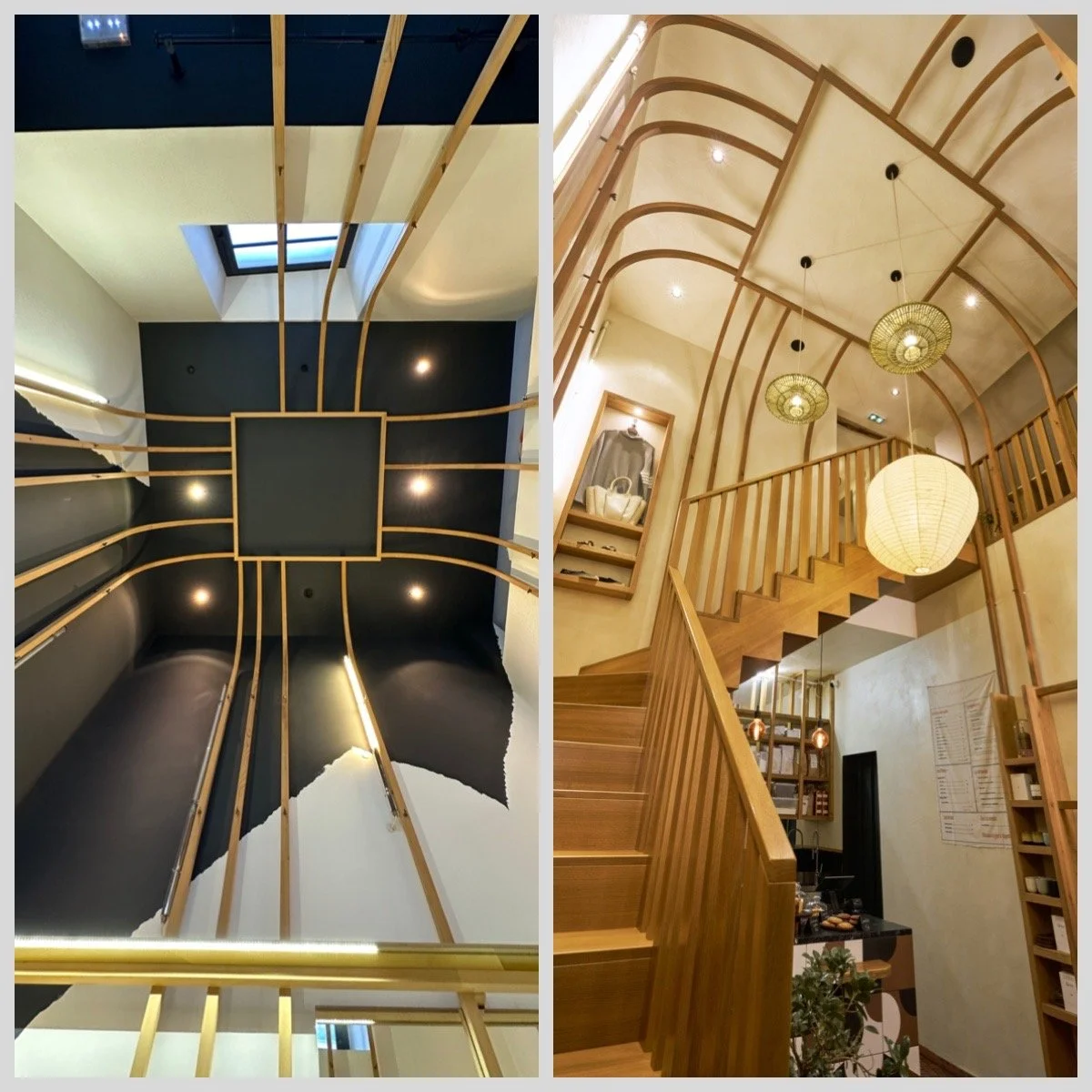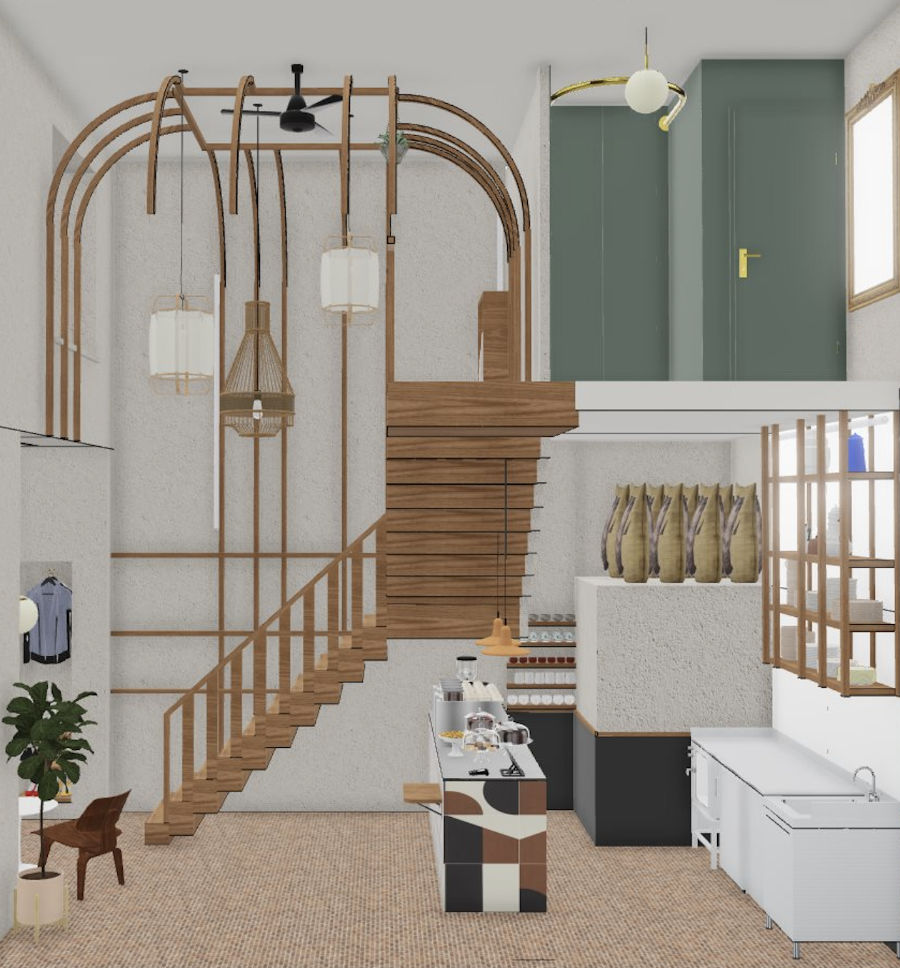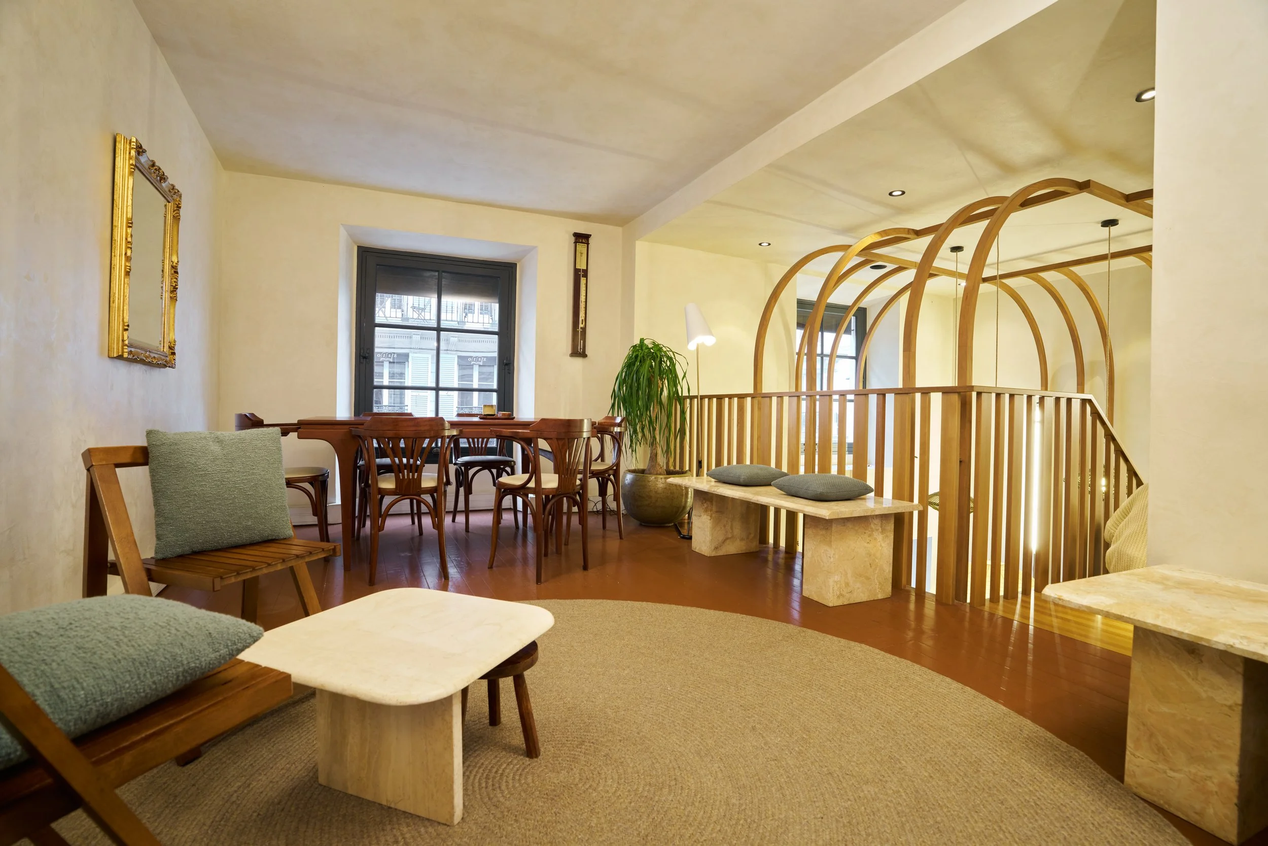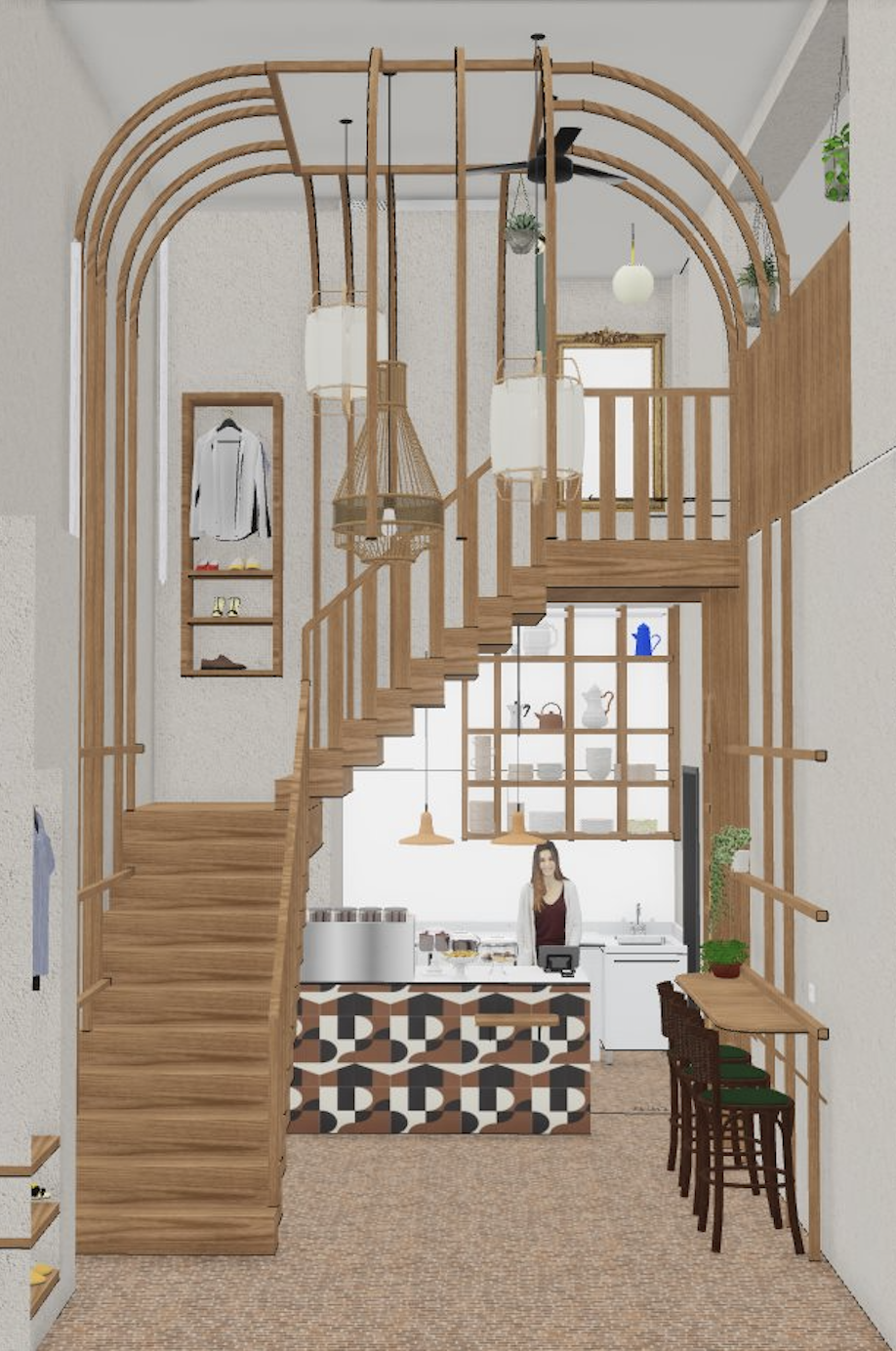Au rez-de-chaussée, la cloison qui séparait l'espace de vente de l'ancienne réserve a été supprimée, créant un espace ouvert destiné à accueillir un bar et une cuisine. L'ancien escalier en colimaçon, qui menait à l'étage où se trouvait le bureau, a été remplacé par un grand escalier d'angle, conçu comme une sculpture centrale dans l'espace. Cet escalier invite naturellement les clients à monter à l'étage, où se déroulent la dégustation et l'essai des vêtements.
