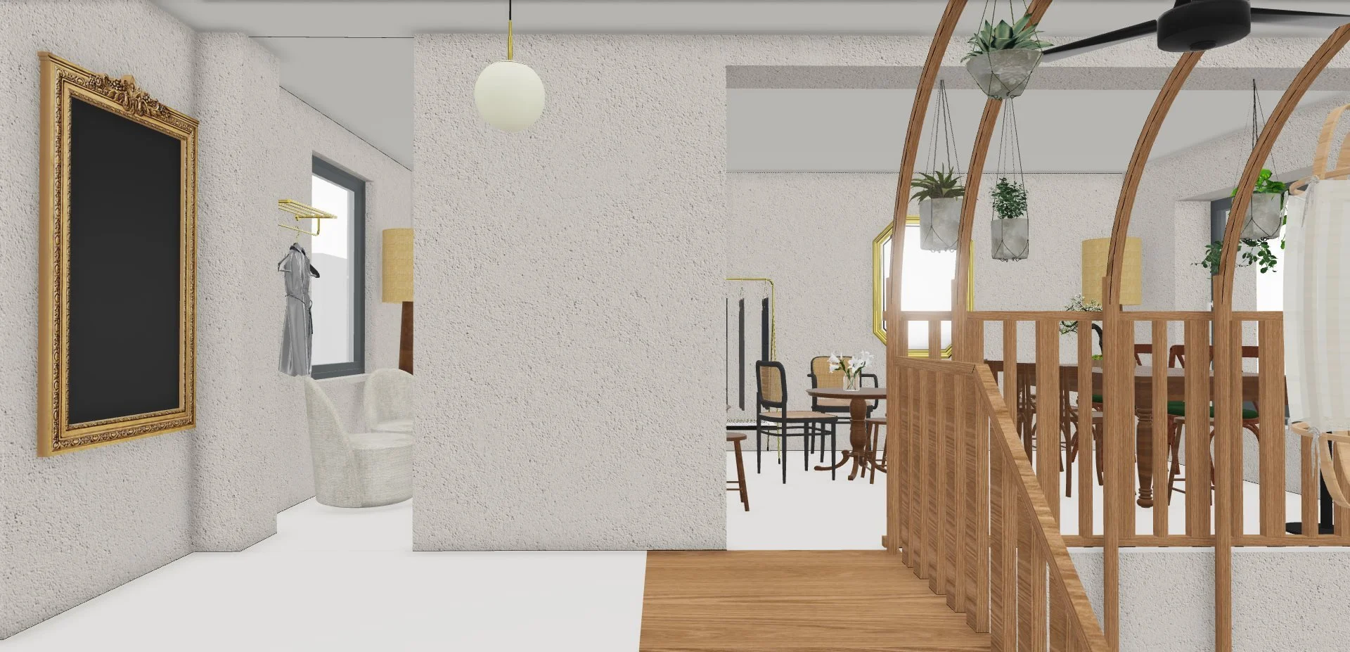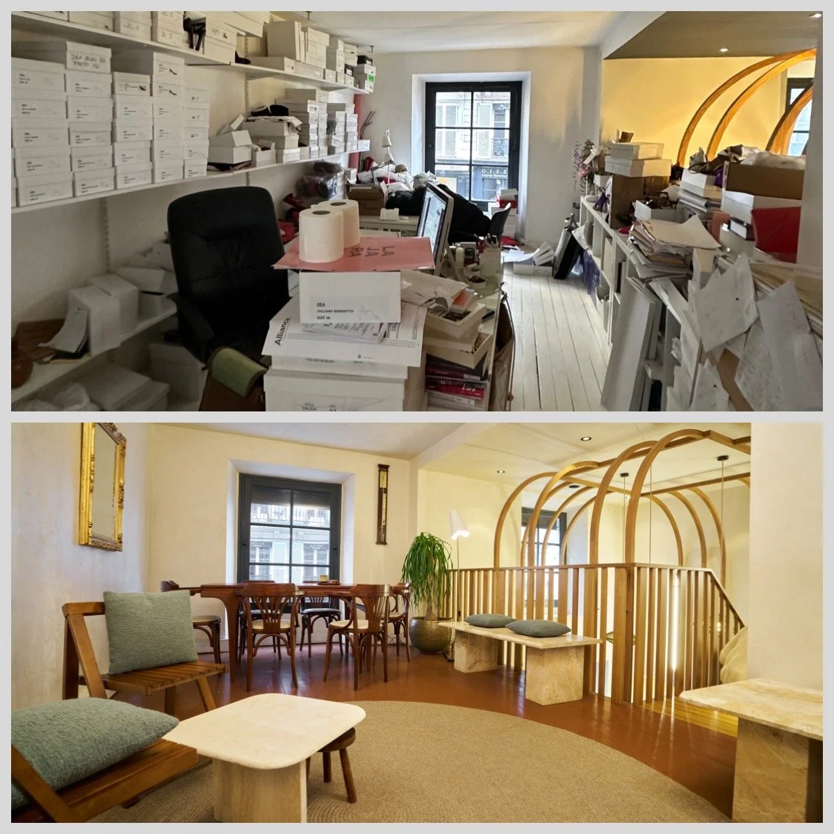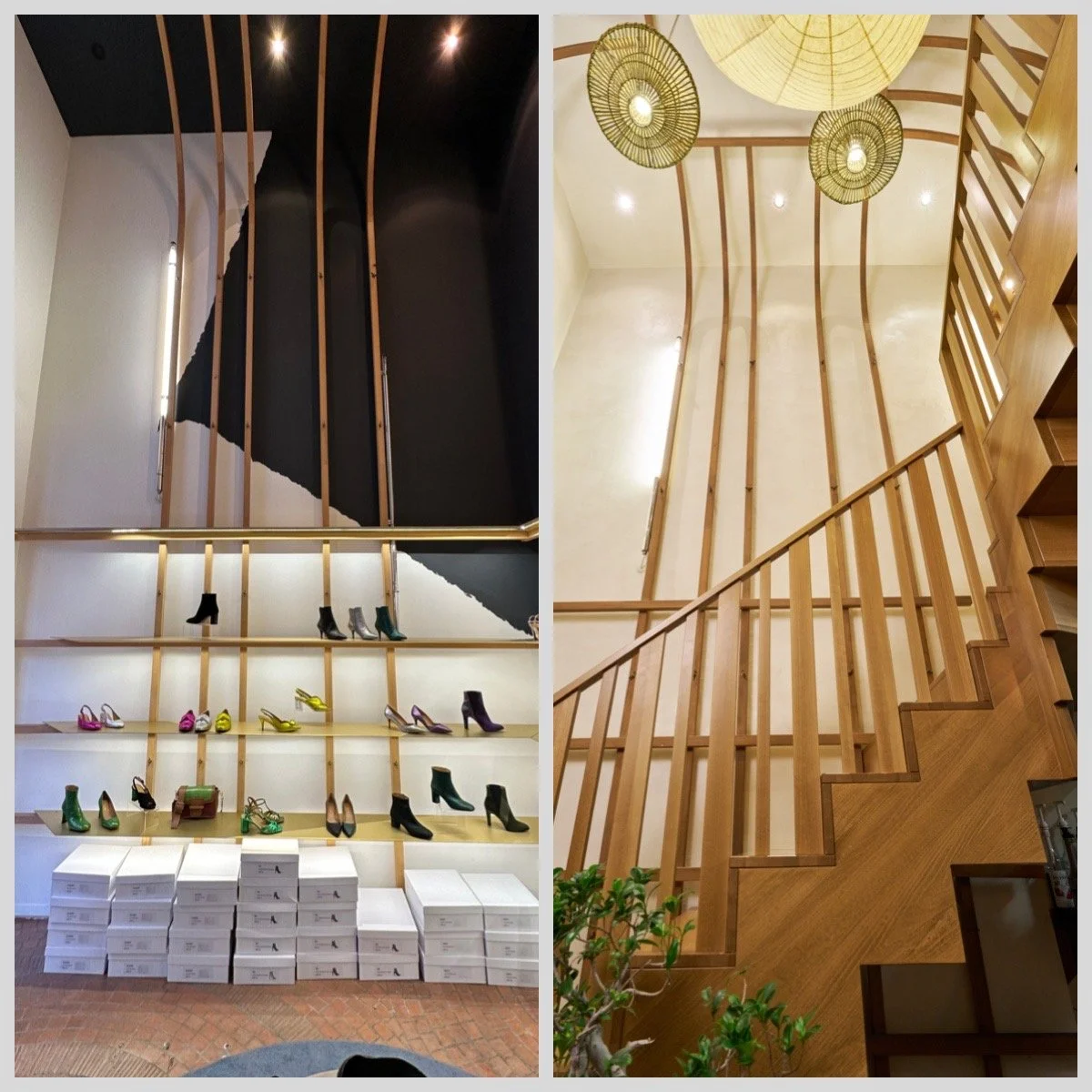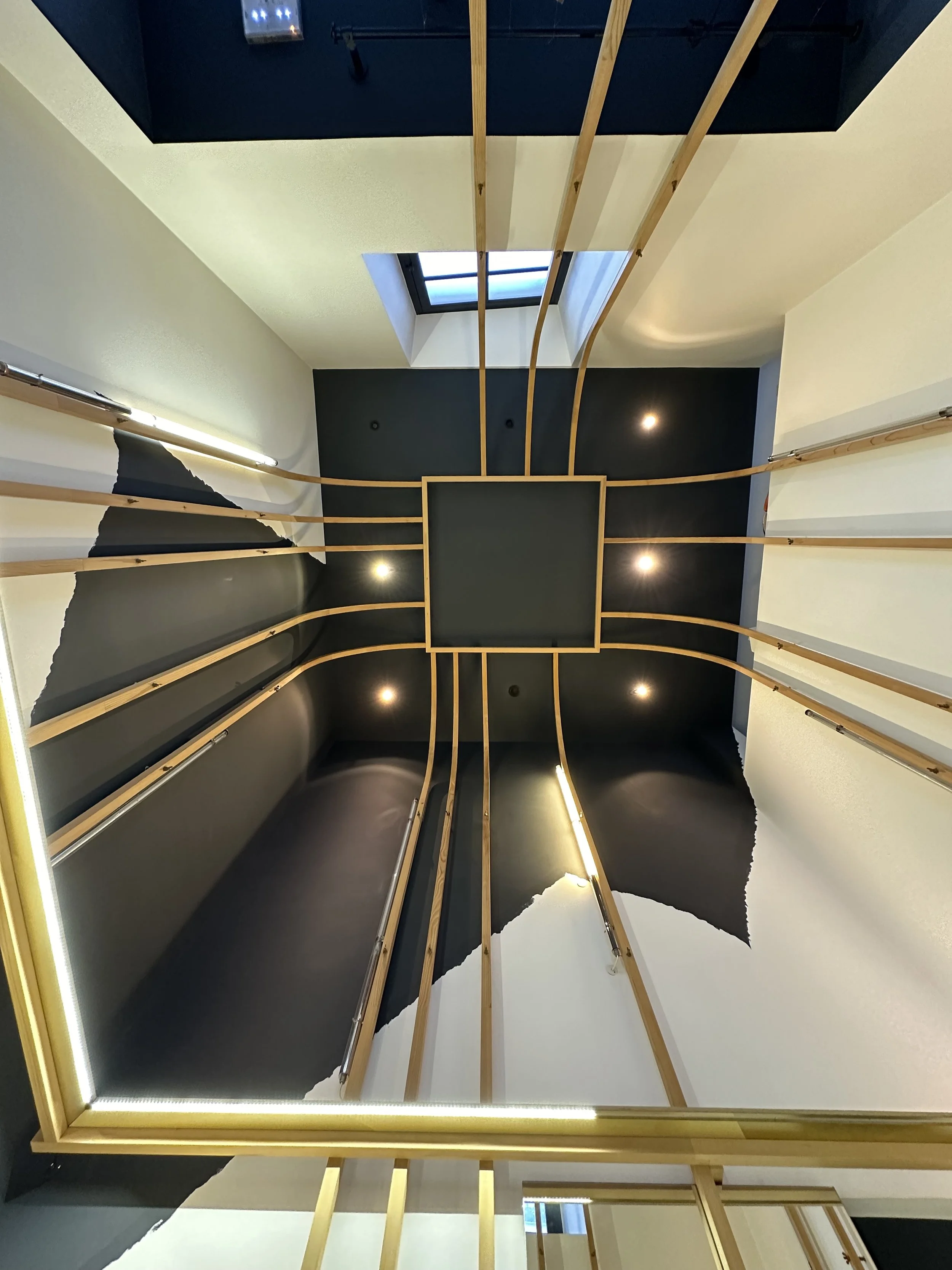 Au rez-de-chaussée, la cloison qui séparait l'espace de vente de l'ancienne réserve a été supprimée, créant un espace ouvert destiné à accueillir un bar et une cuisine. L'ancien escalier en colimaçon, qui menait à l'étage où se trouvait le bureau, a été remplacé par un grand escalier d'angle, conçu comme une sculpture centrale dans l'espace. Cet escalier invite naturellement les clients à monter à l'étage, où se déroulent la dégustation et l'essai des vêtements.