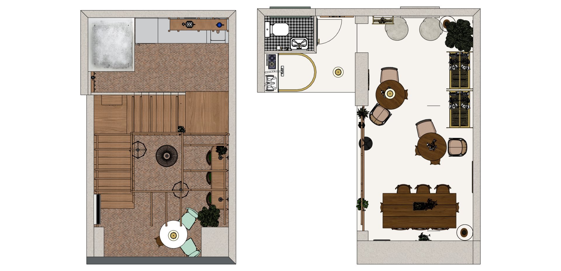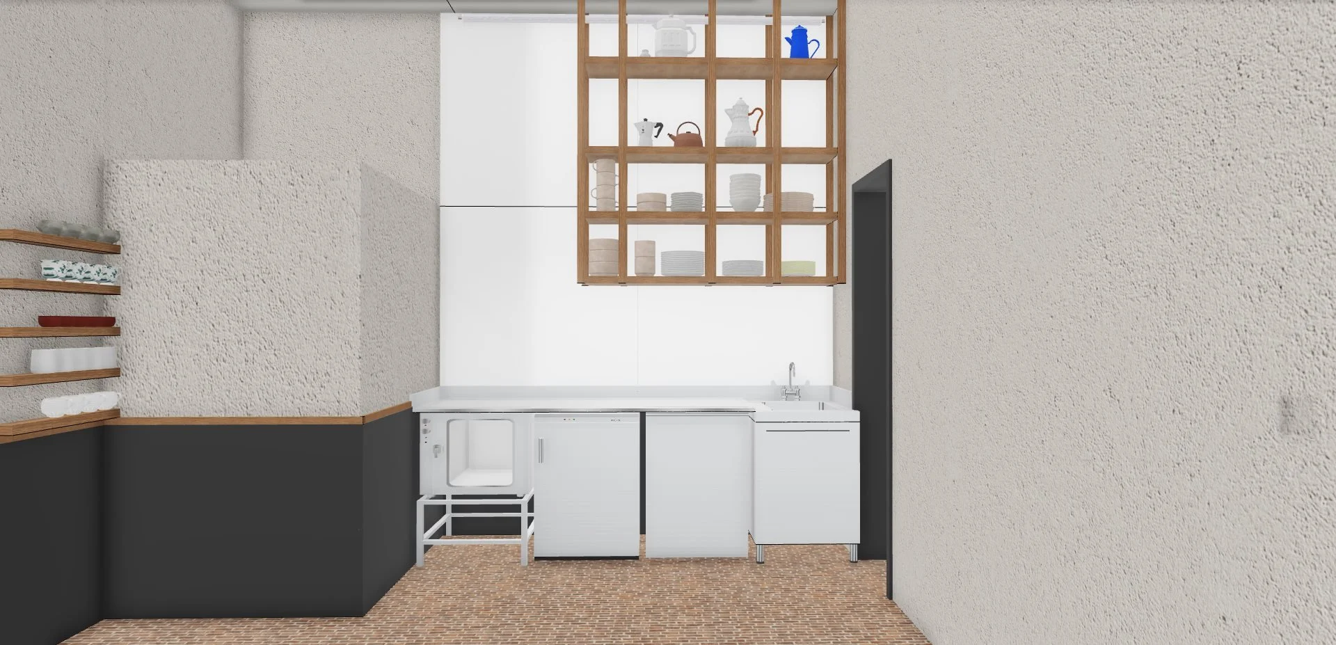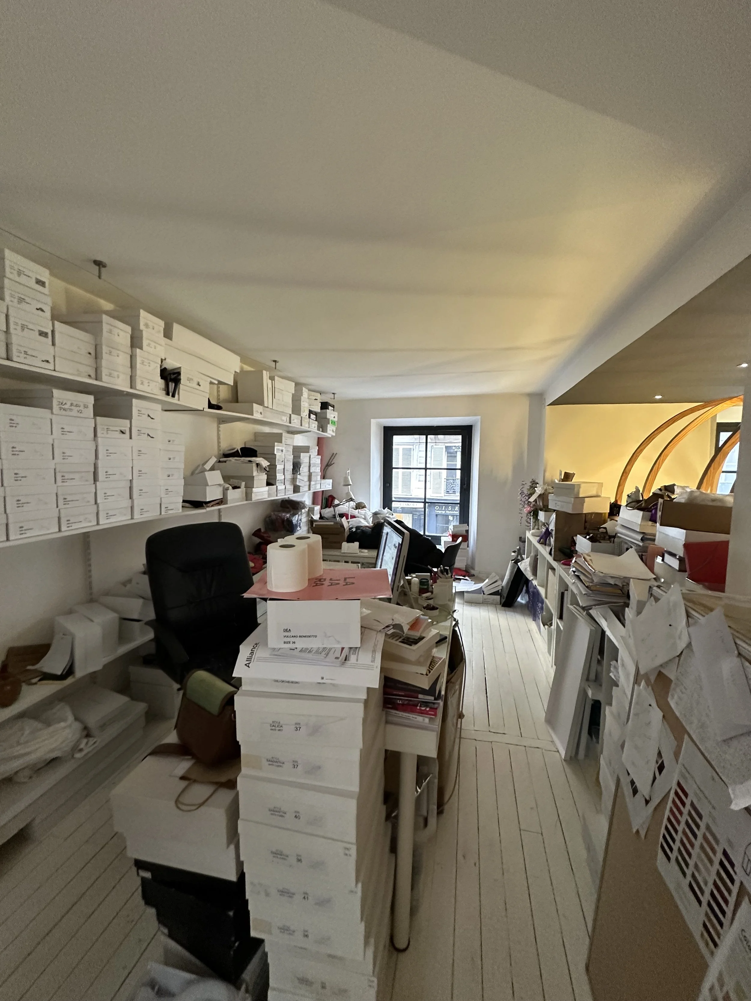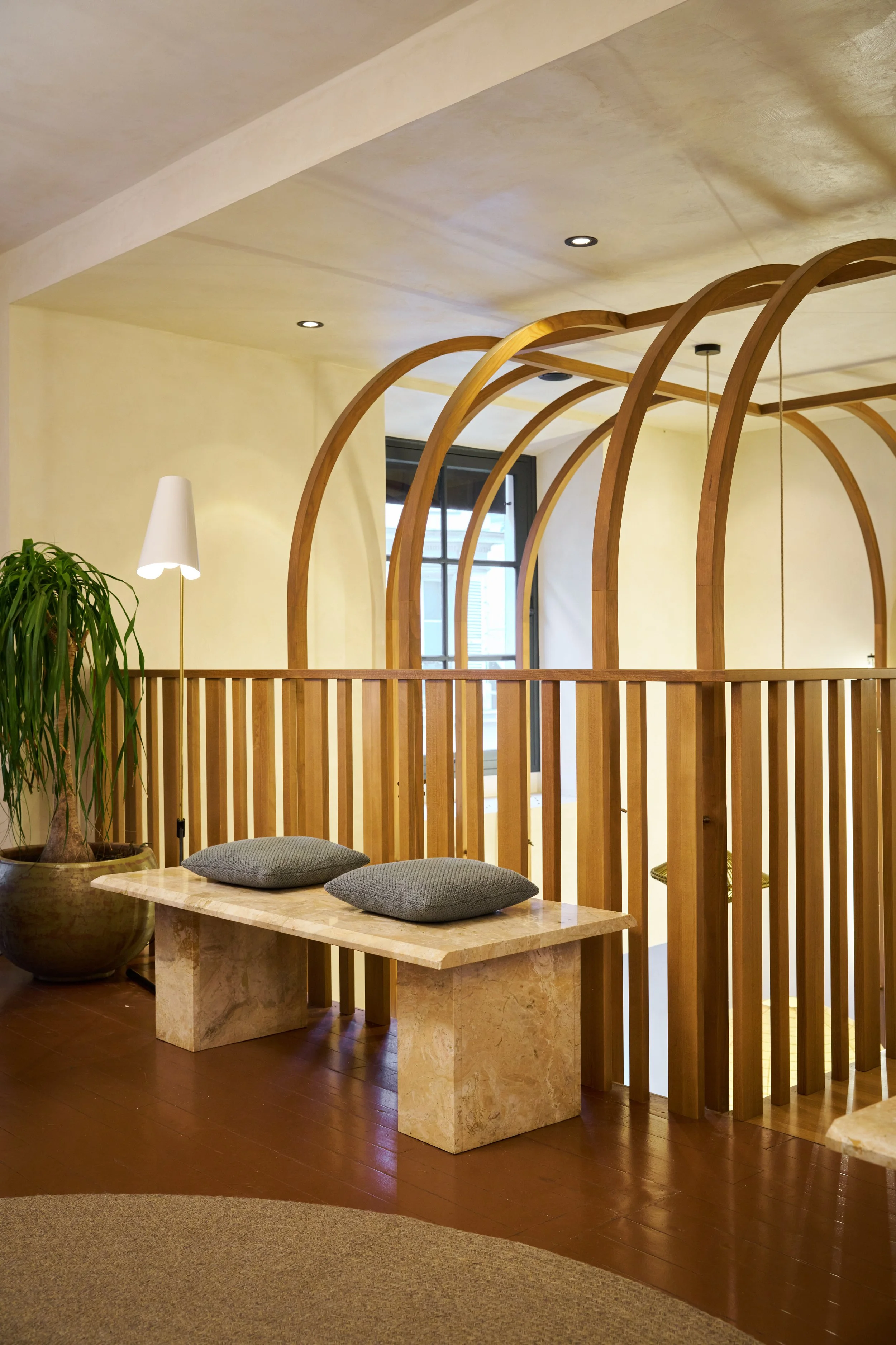 Au rez-de-chaussée, la cloison qui séparait l'espace de vente de l'ancienne réserve a été supprimée, créant un espace ouvert destiné à accueillir un bar et une cuisine. L'ancien escalier en colimaçon, qui menait à l'étage où se trouvait le bureau, a été remplacé par un grand escalier d'angle, conçu comme une sculpture centrale dans l'espace. Cet escalier invite naturellement les clients à monter à l'étage, où se déroulent la dégustation et l'essai des vêtements.