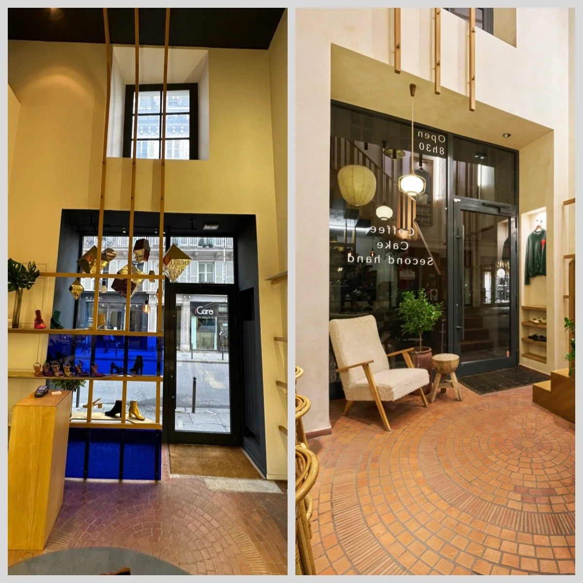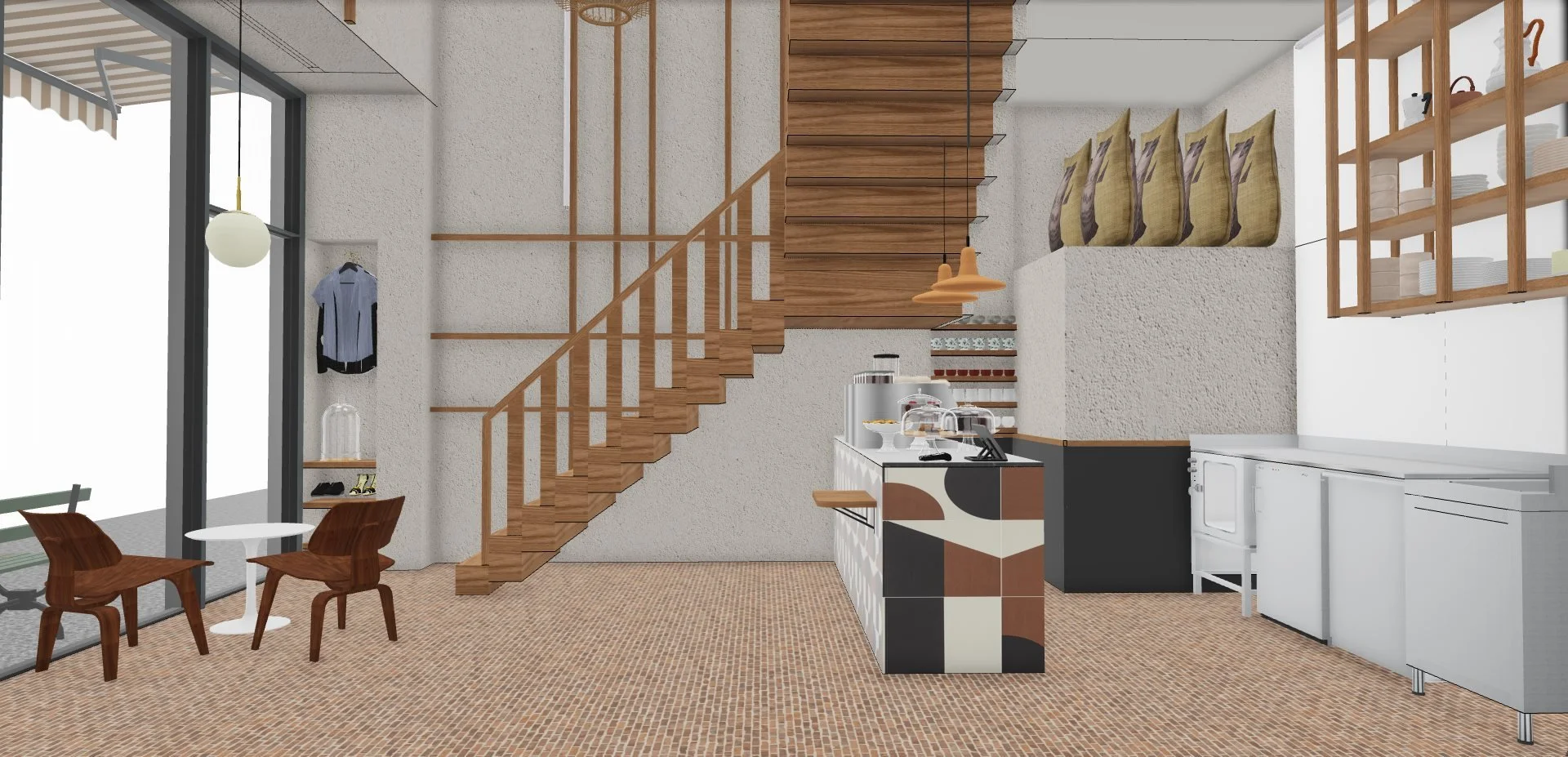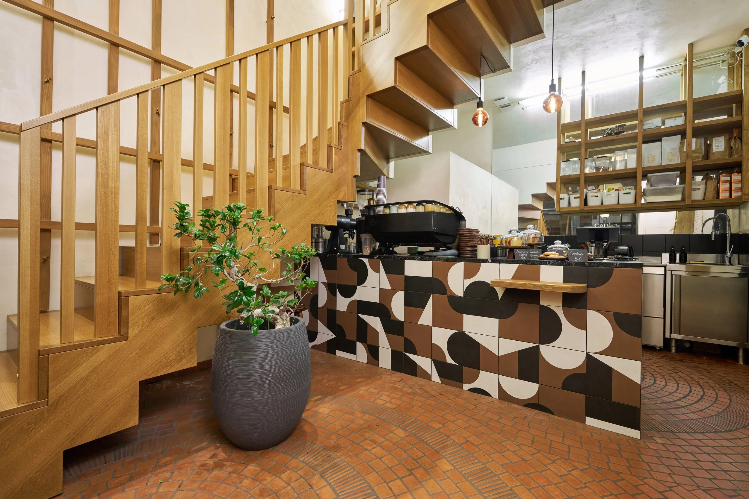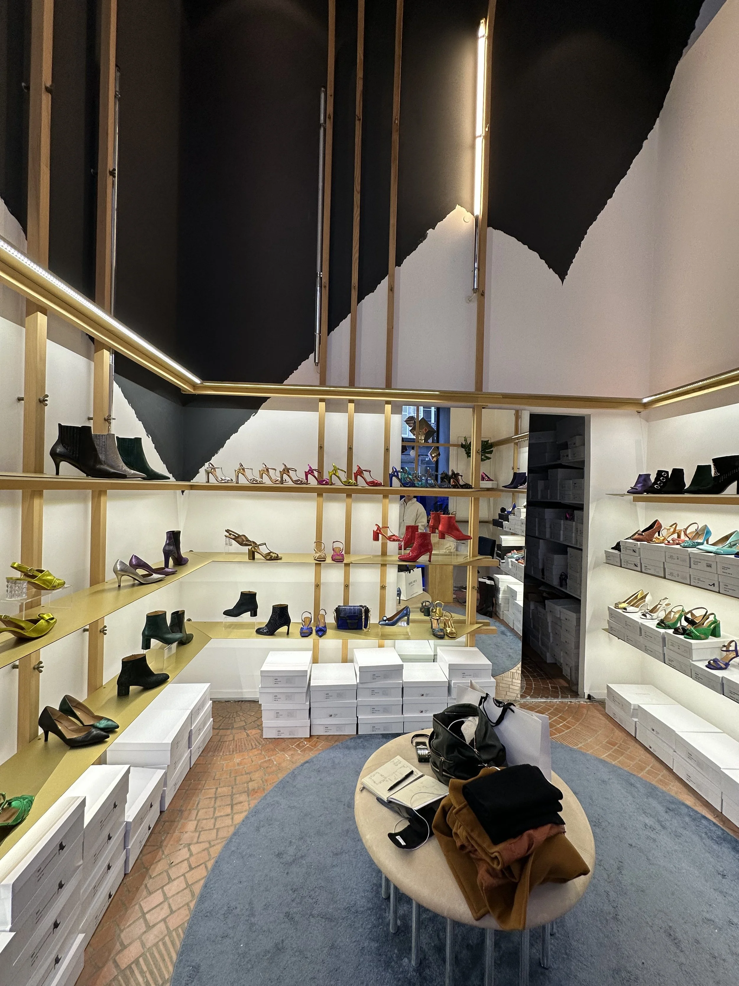 Le projet consiste à transformer une ancienne boutique de chaussures en un café original, combinant la vente de cafés de qualité, de pâtisseries artisanales et de vêtements de seconde main de luxe. Deux éléments d'origine ont été préservés : le sol, soigneusement rénové, et une structure en bois clair en forme de cage, teinte et adaptée pour s'harmoniser avec le nouveau design.