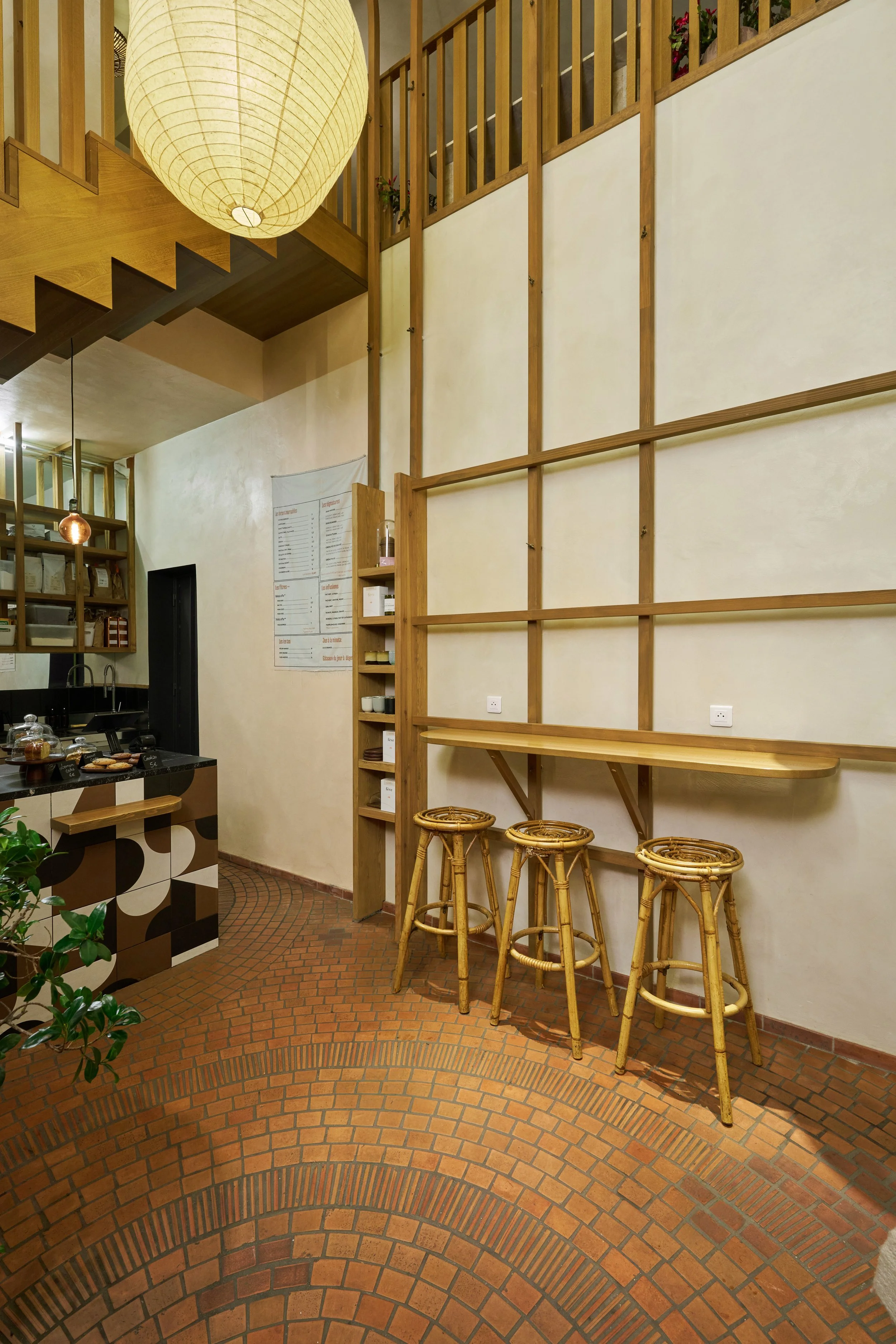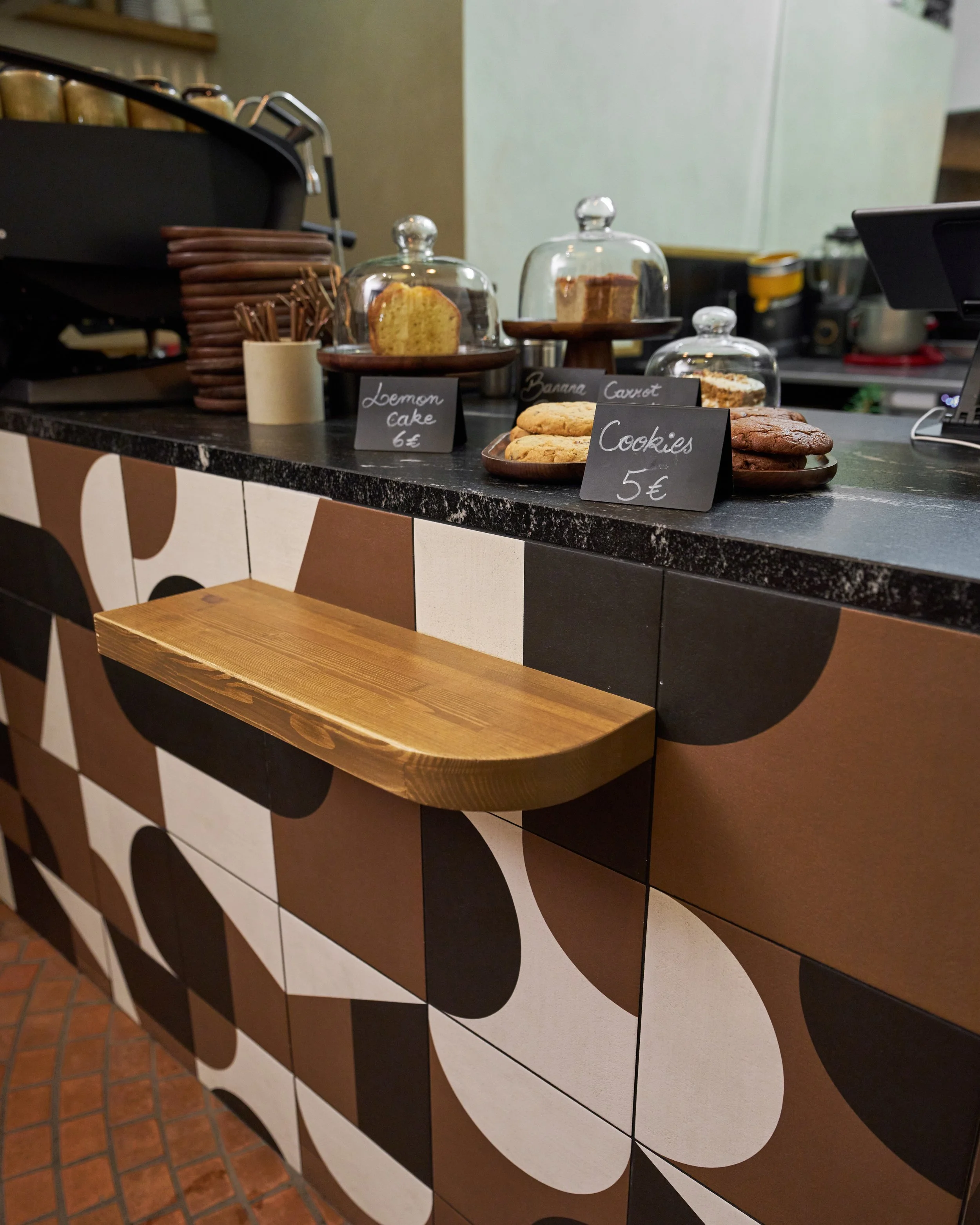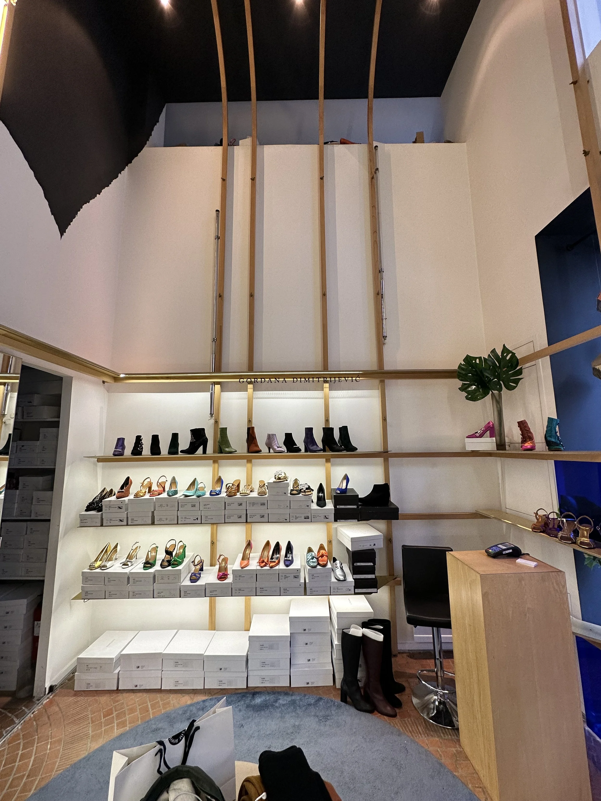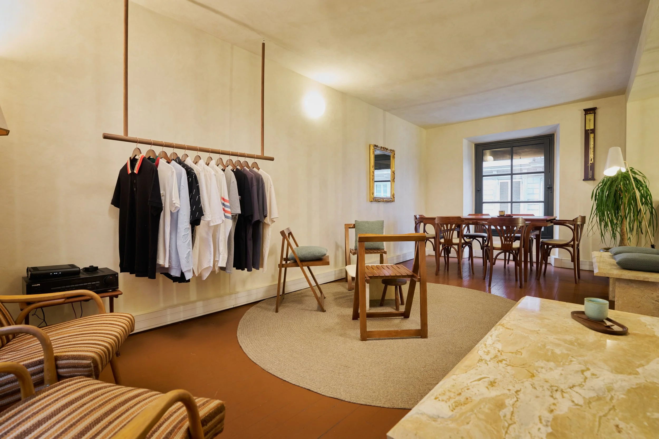 Le projet consiste à transformer une ancienne boutique de chaussures en un café original, combinant la vente de cafés de qualité, de pâtisseries artisanales et de vêtements de seconde main de luxe. Deux éléments d'origine ont été préservés : le sol, soigneusement rénové, et une structure en bois clair en forme de cage, teinte et adaptée pour s'harmoniser avec le nouveau design.