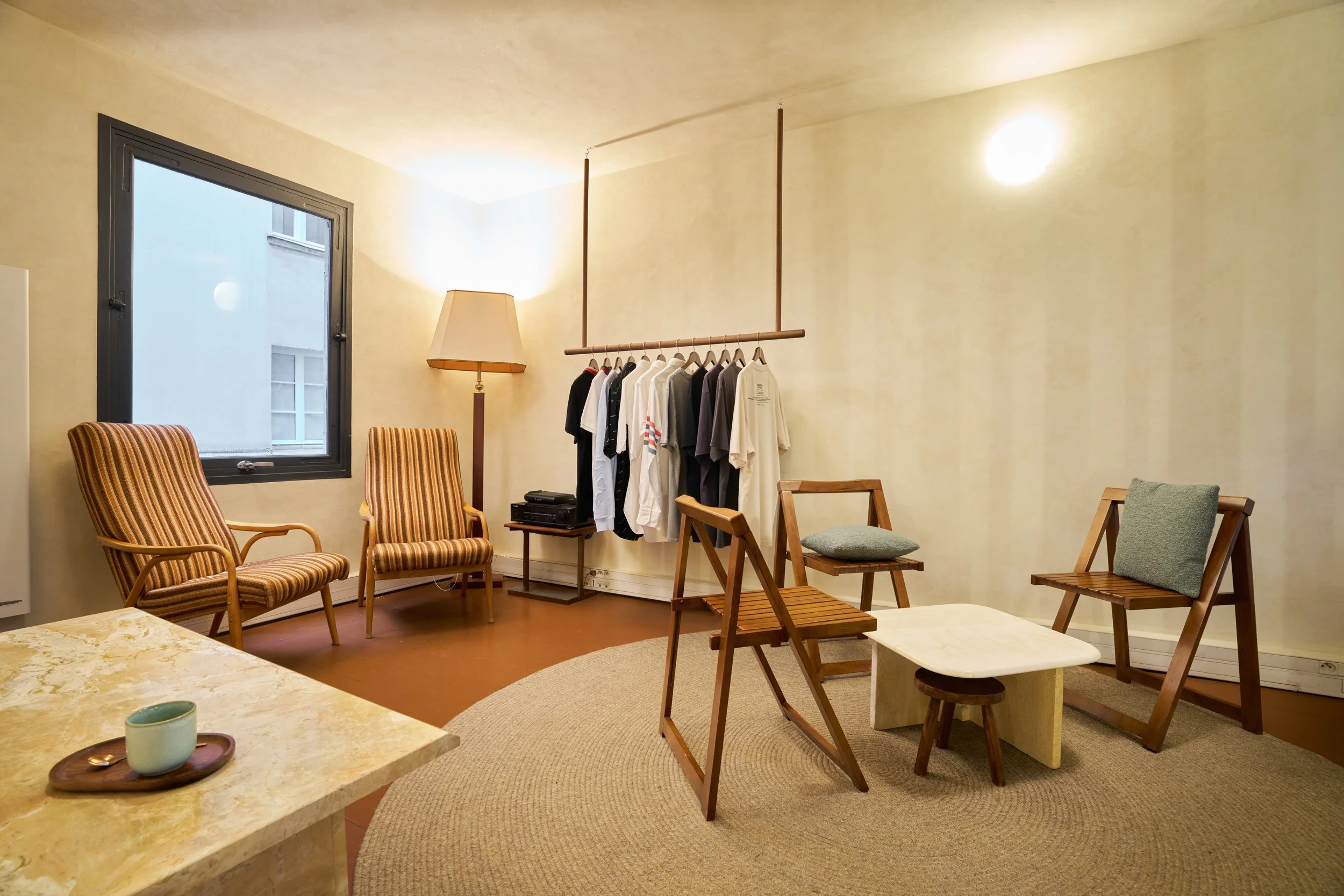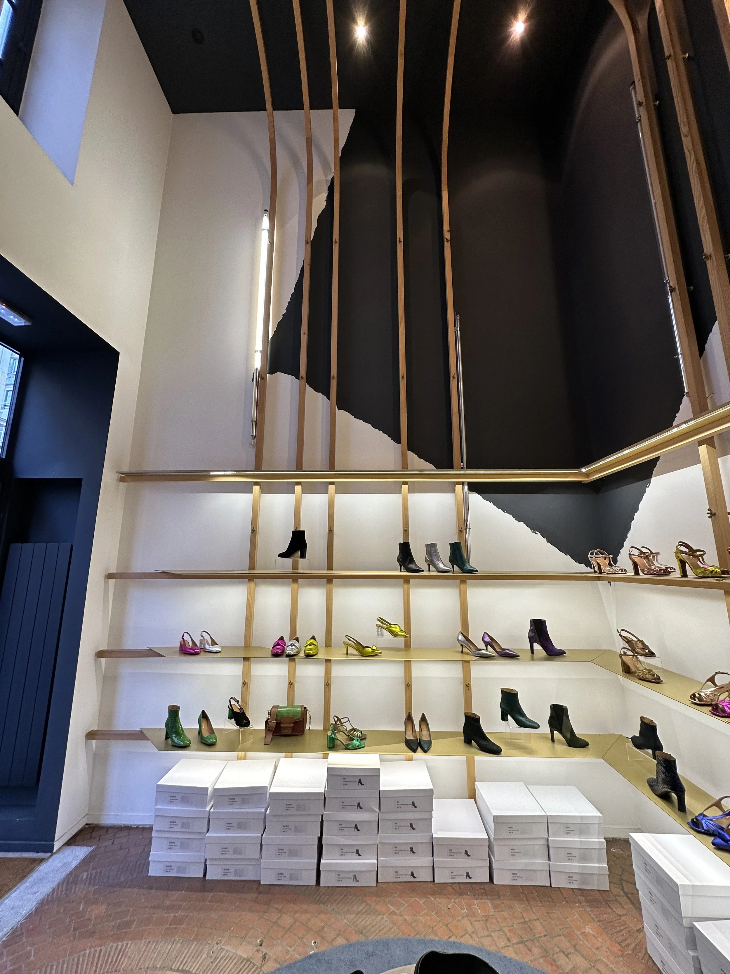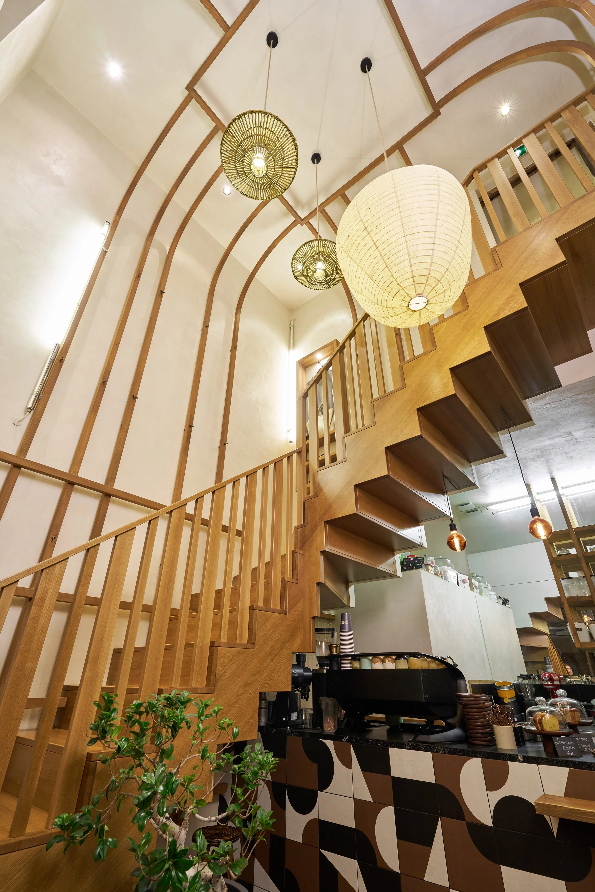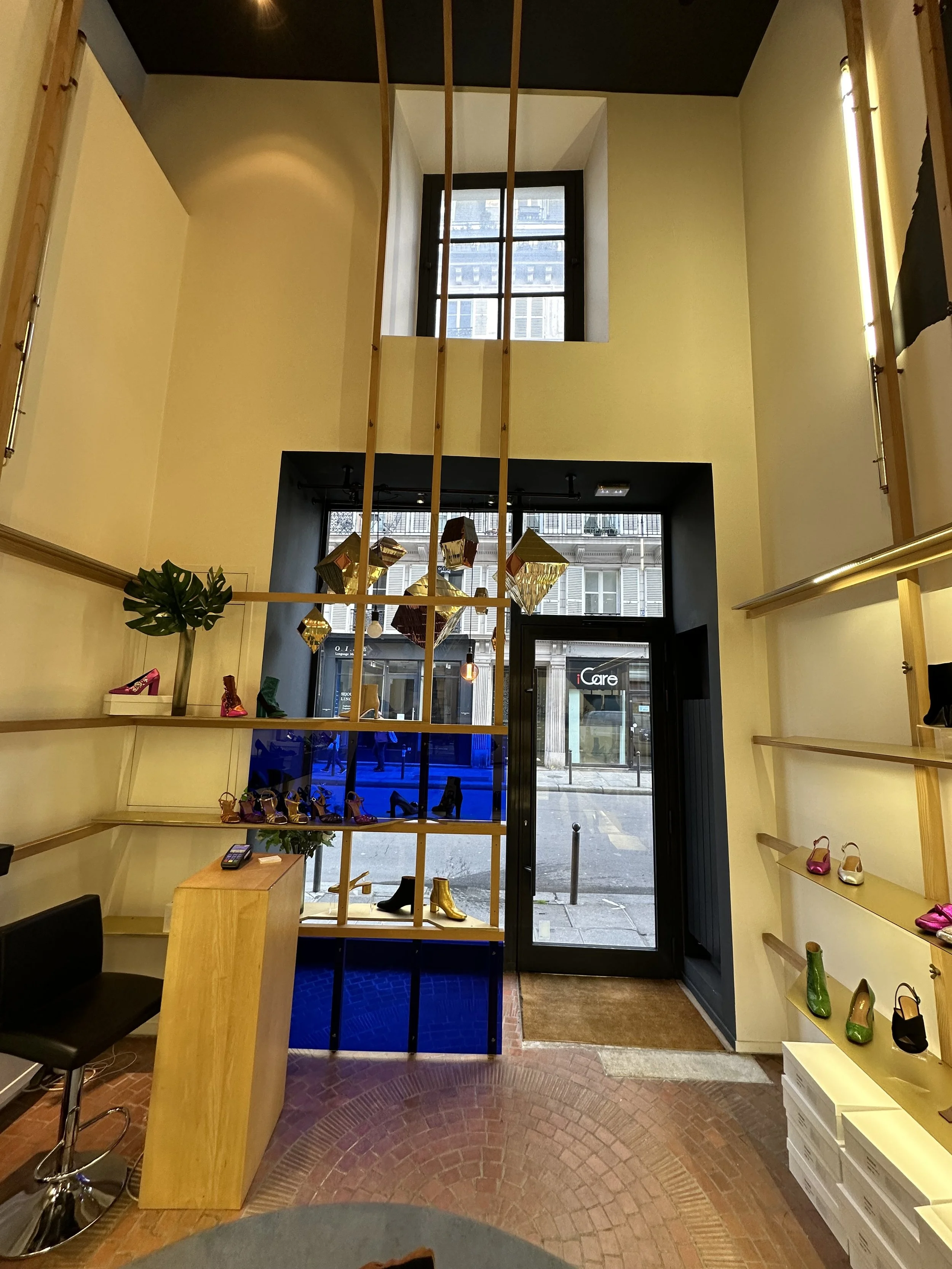 Le projet consiste à transformer une ancienne boutique de chaussures en un café original, combinant la vente de cafés de qualité, de pâtisseries artisanales et de vêtements de seconde main de luxe. Deux éléments d'origine ont été préservés : le sol, soigneusement rénové, et une structure en bois clair en forme de cage, teinte et adaptée pour s'harmoniser avec le nouveau design.