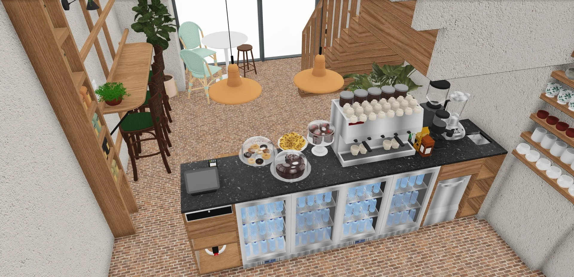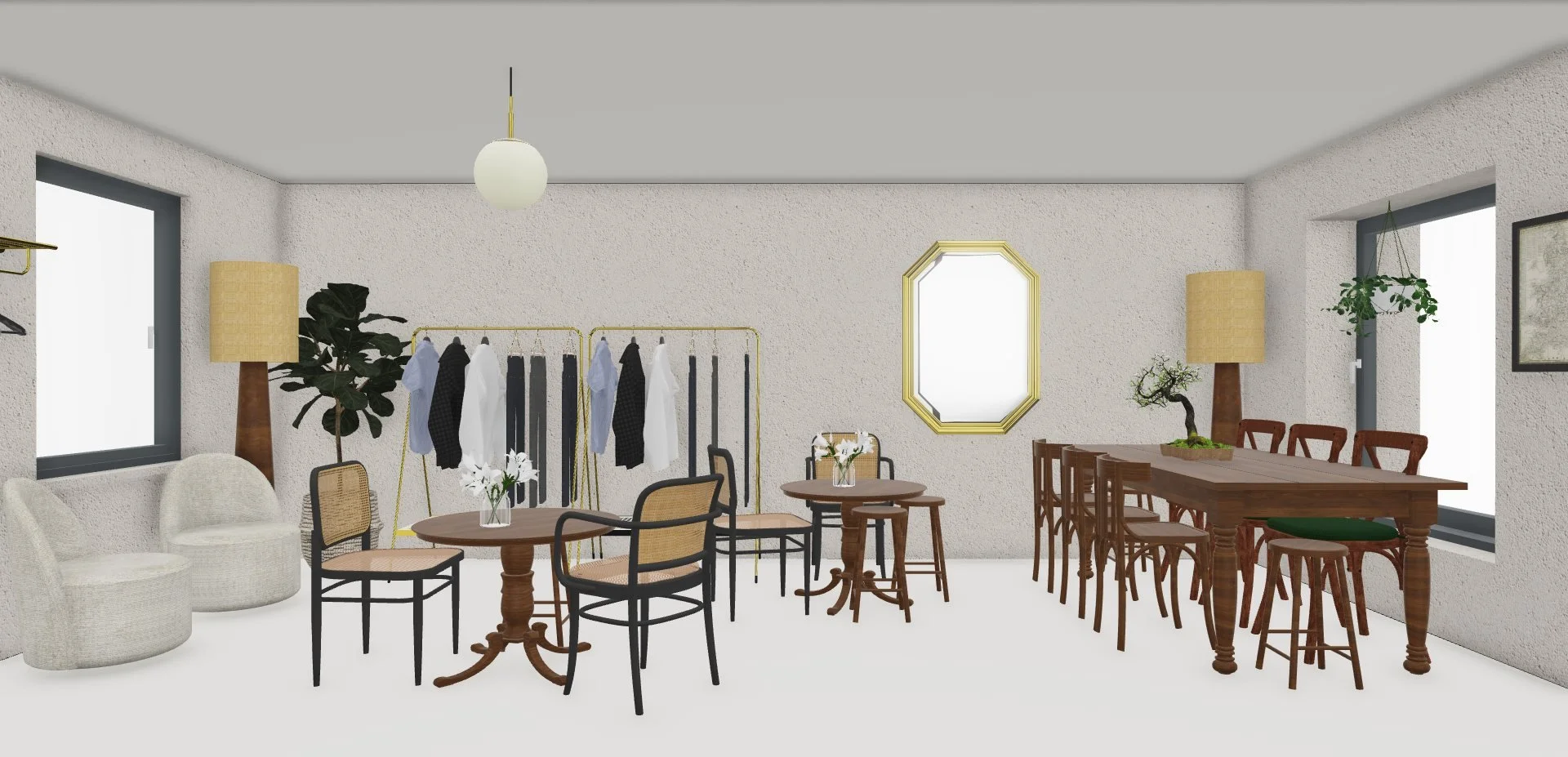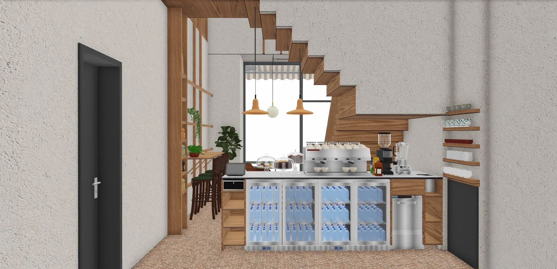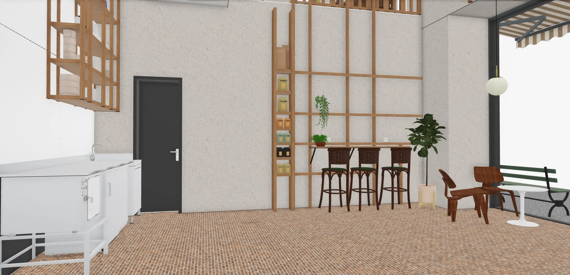 Le projet consiste à transformer une ancienne boutique de chaussures en un café original, combinant la vente de cafés de qualité, de pâtisseries artisanales et de vêtements de seconde main de luxe. Deux éléments d'origine ont été préservés : le sol, soigneusement rénové, et une structure en bois clair en forme de cage, teinte et adaptée pour s'harmoniser avec le nouveau design.