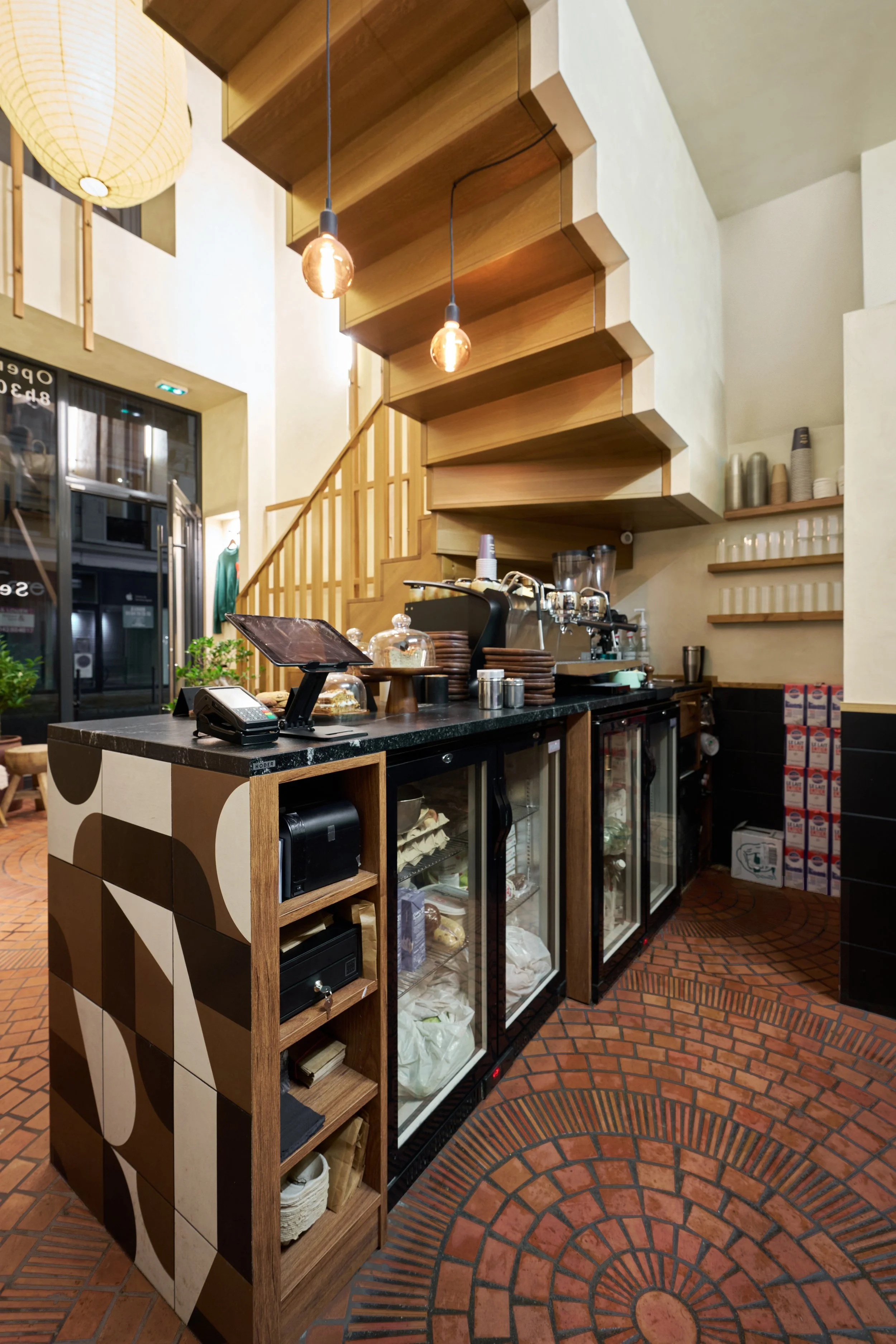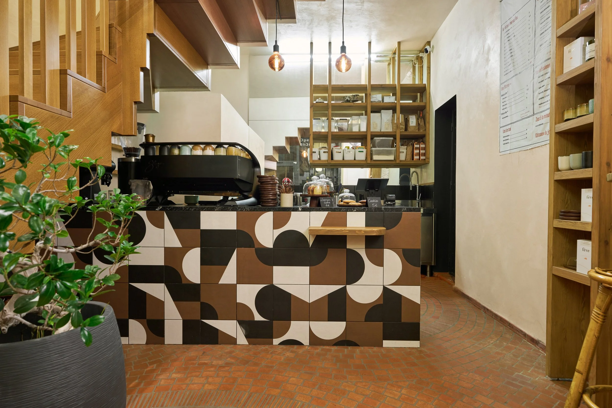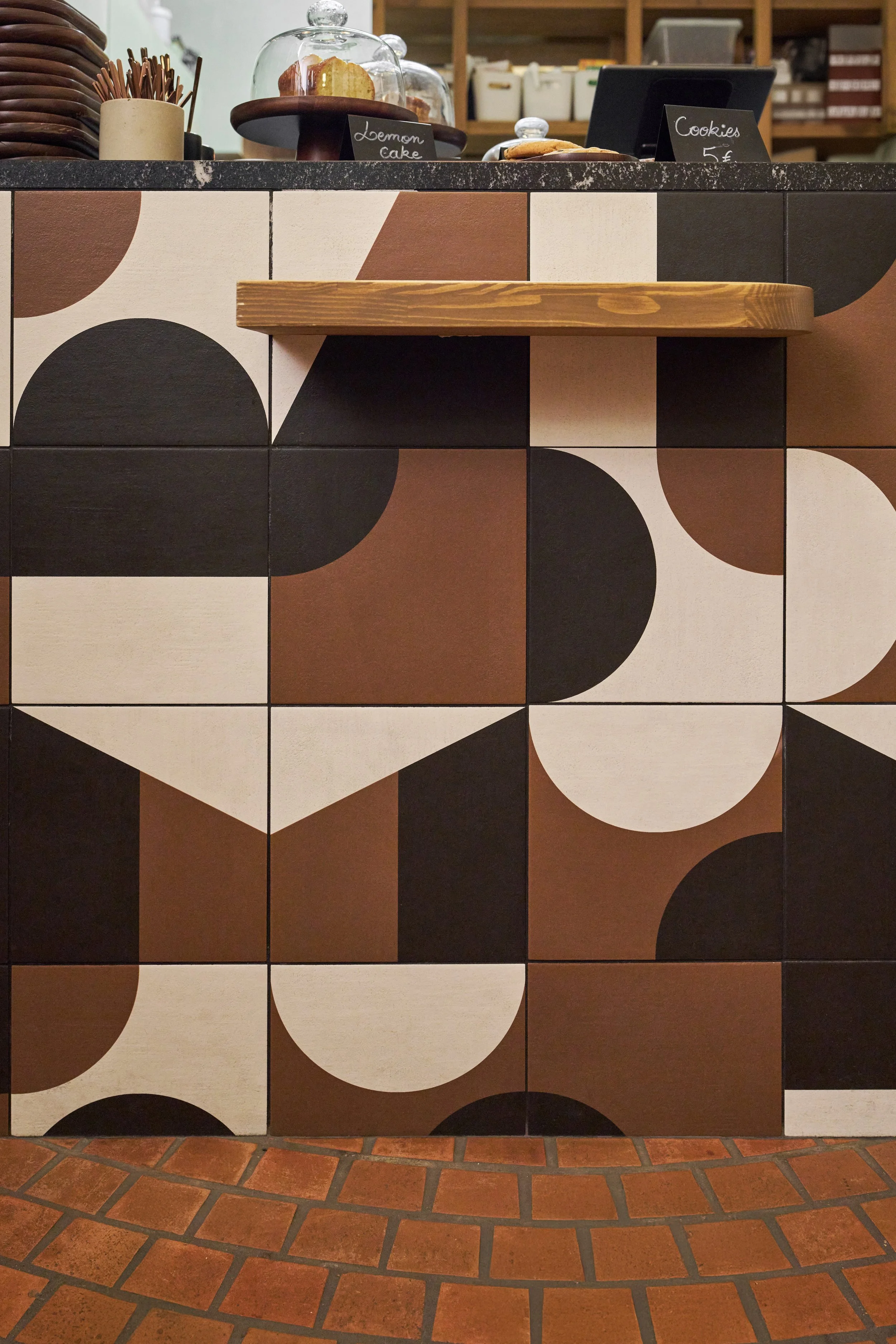 Pour attirer l'attention vers l'intérieur de la boutique, un bandeau de carrelage graphique de la collection Puzzle de Mutina a été posé sur le bar, recouvert de granit noir. Au fond de la cuisine, une fenêtre condamnée a été dissimulée derrière de grands miroirs, permettant ainsi de réfléchir la lumière et d'apporter une sensation de profondeur au rez-de-chaussée, qui ne mesure que 20 m². Devant ces miroirs, un système d'étagères suspendues sur mesure a été intégré, offrant des solutions de rangement tout en préservant une esthétique légère.
