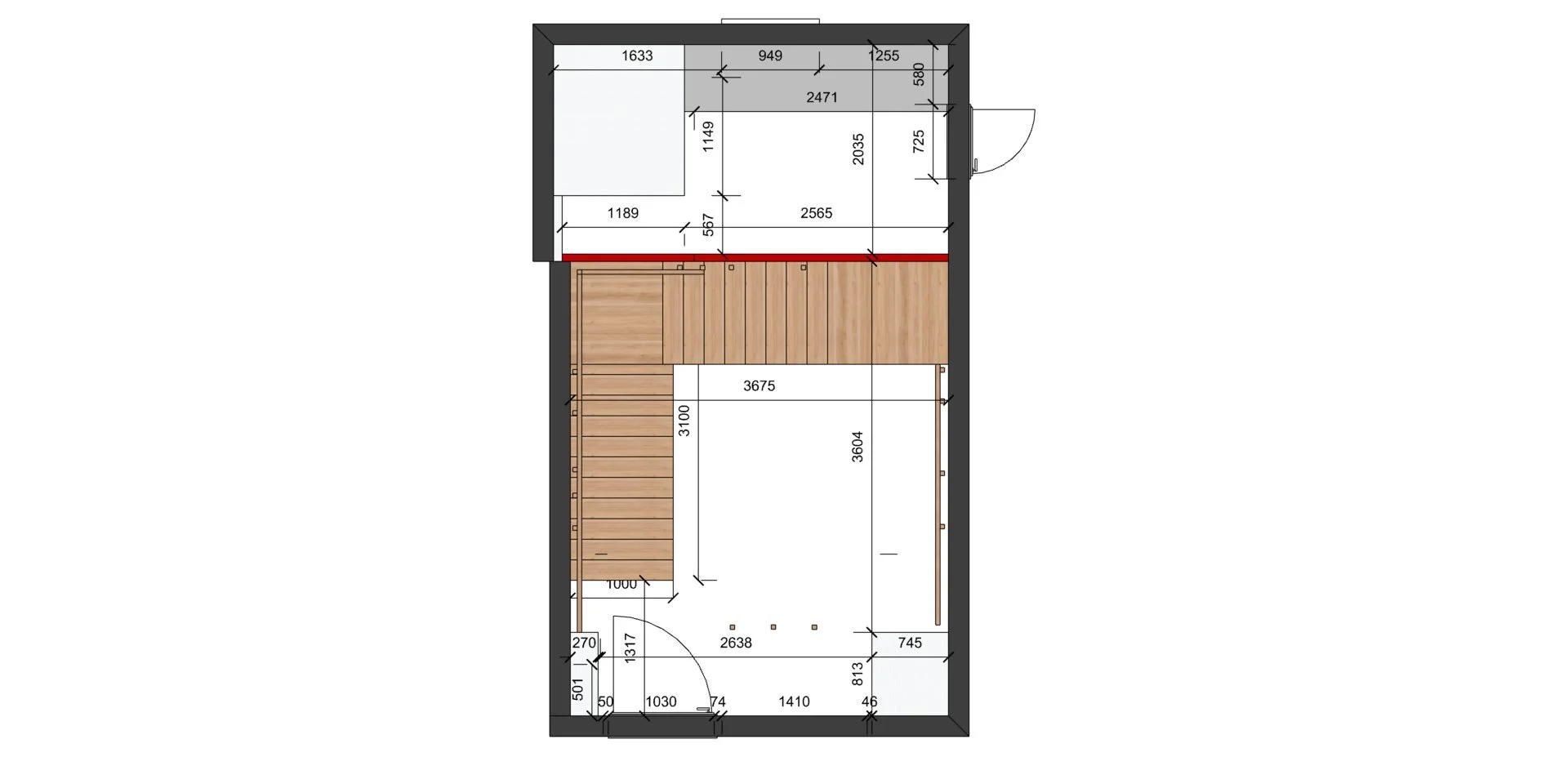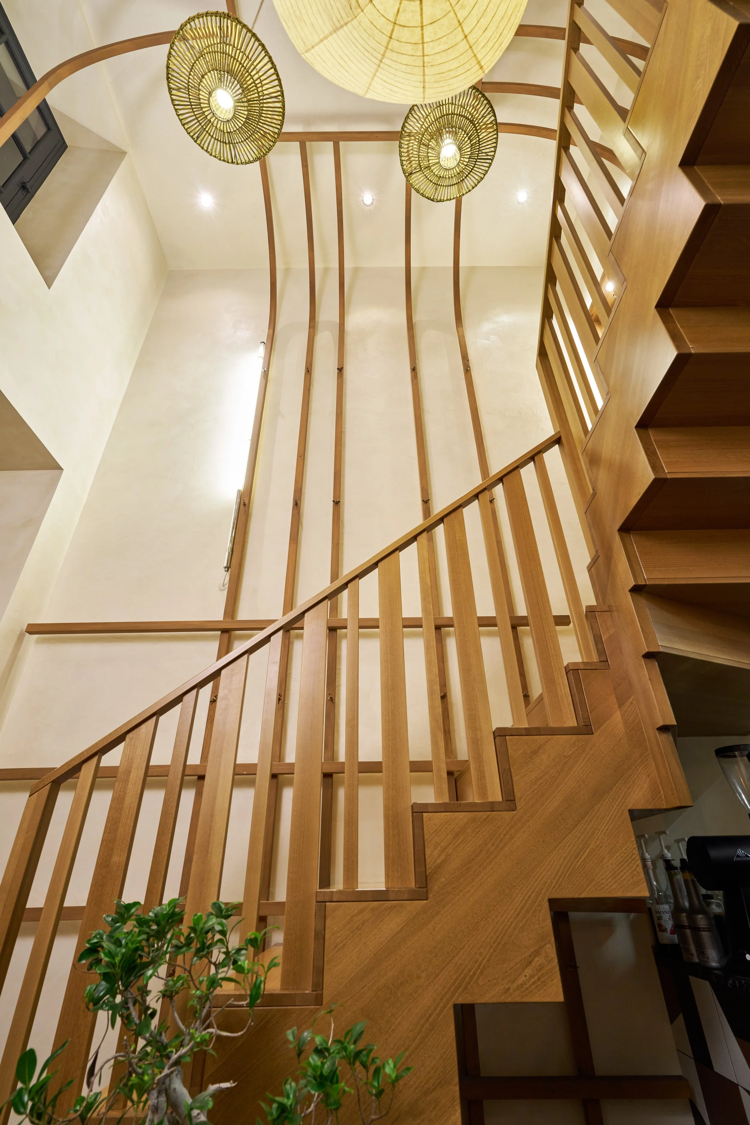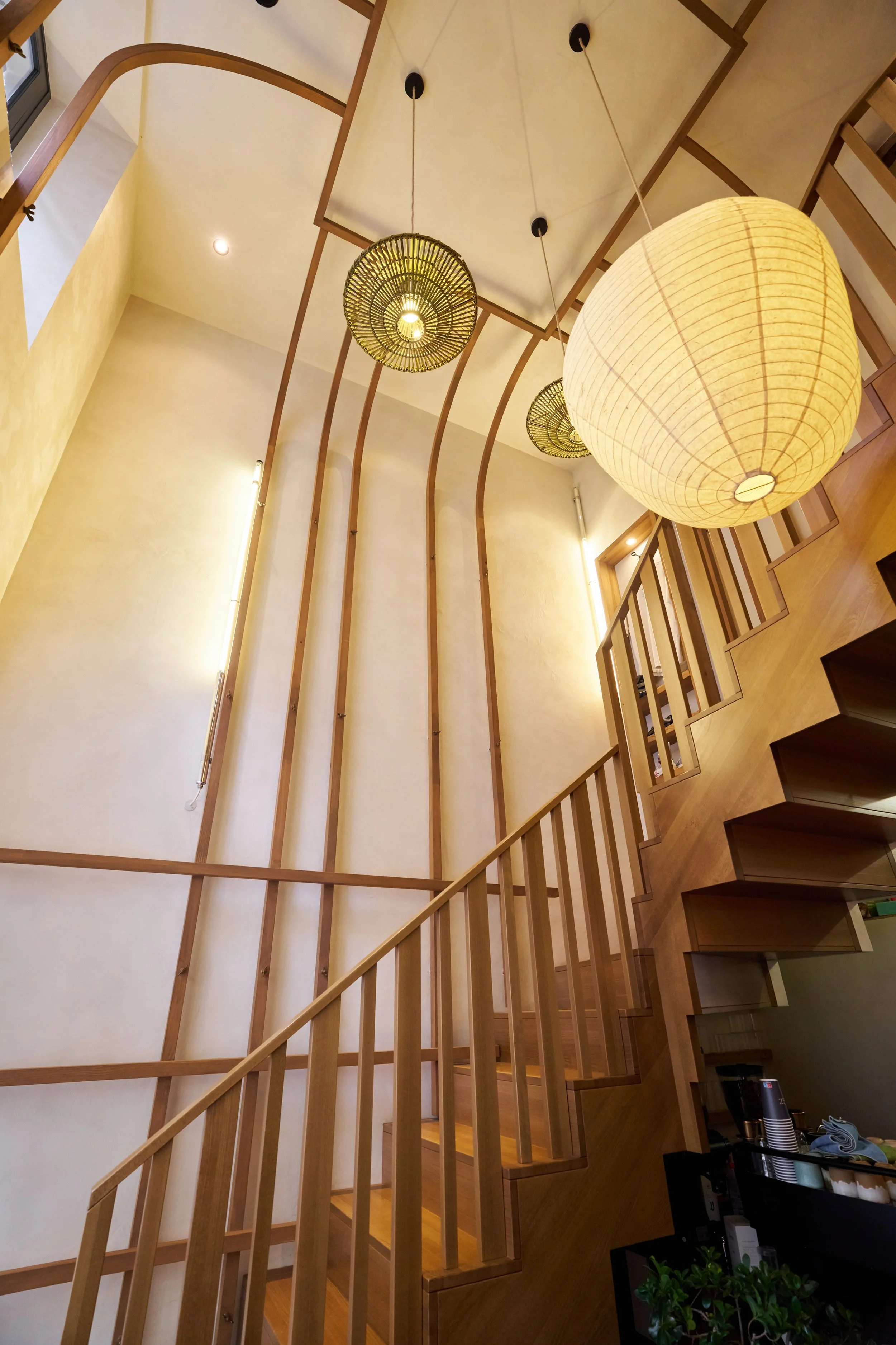 Afin de renforcer l'atmosphère chaleureuse et élégante, les murs et plafonds ont été recouverts d'une peinture à la chaux dans des tons naturels, mettant en valeur les éléments en pin et hêtre, teints dans une teinte de chêne moyen. Le mobilier sur mesure a été soigneusement conçu pour s'adapter à la structure en forme de cage, dont les tasseaux mesurent 4 cm de section, apportant une touche de cohérence à l'ensemble.