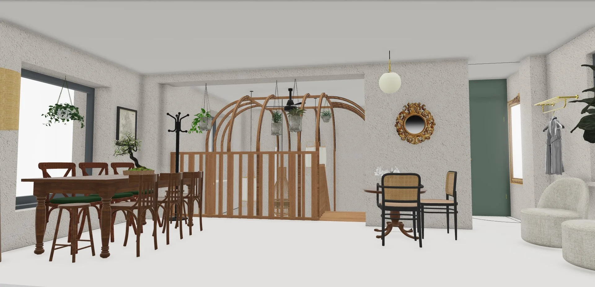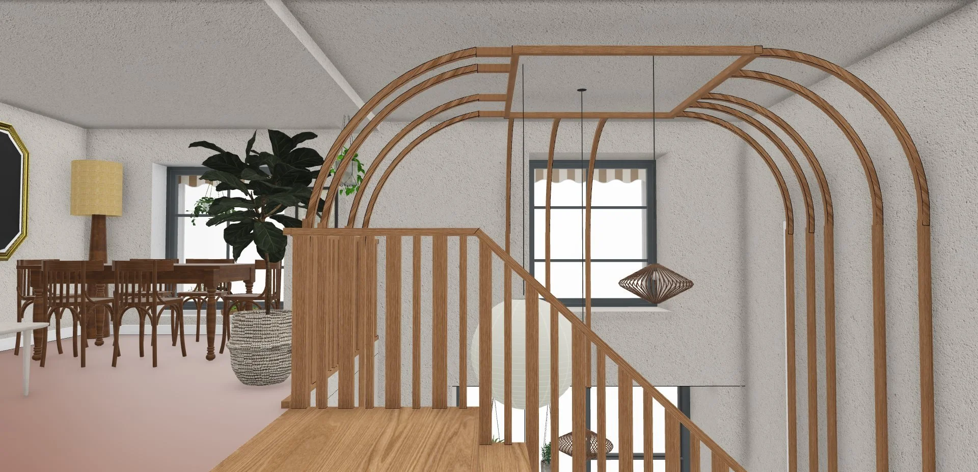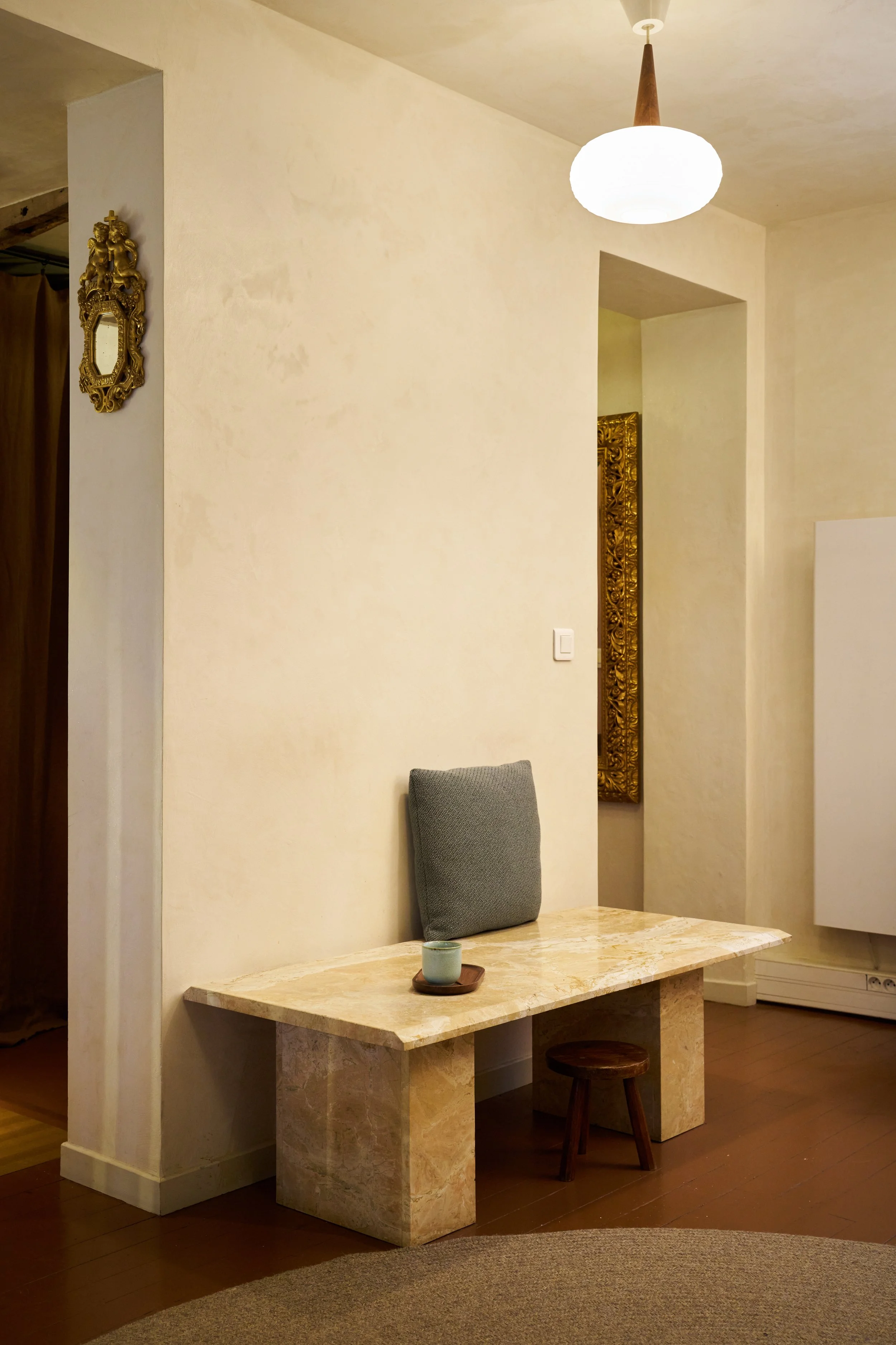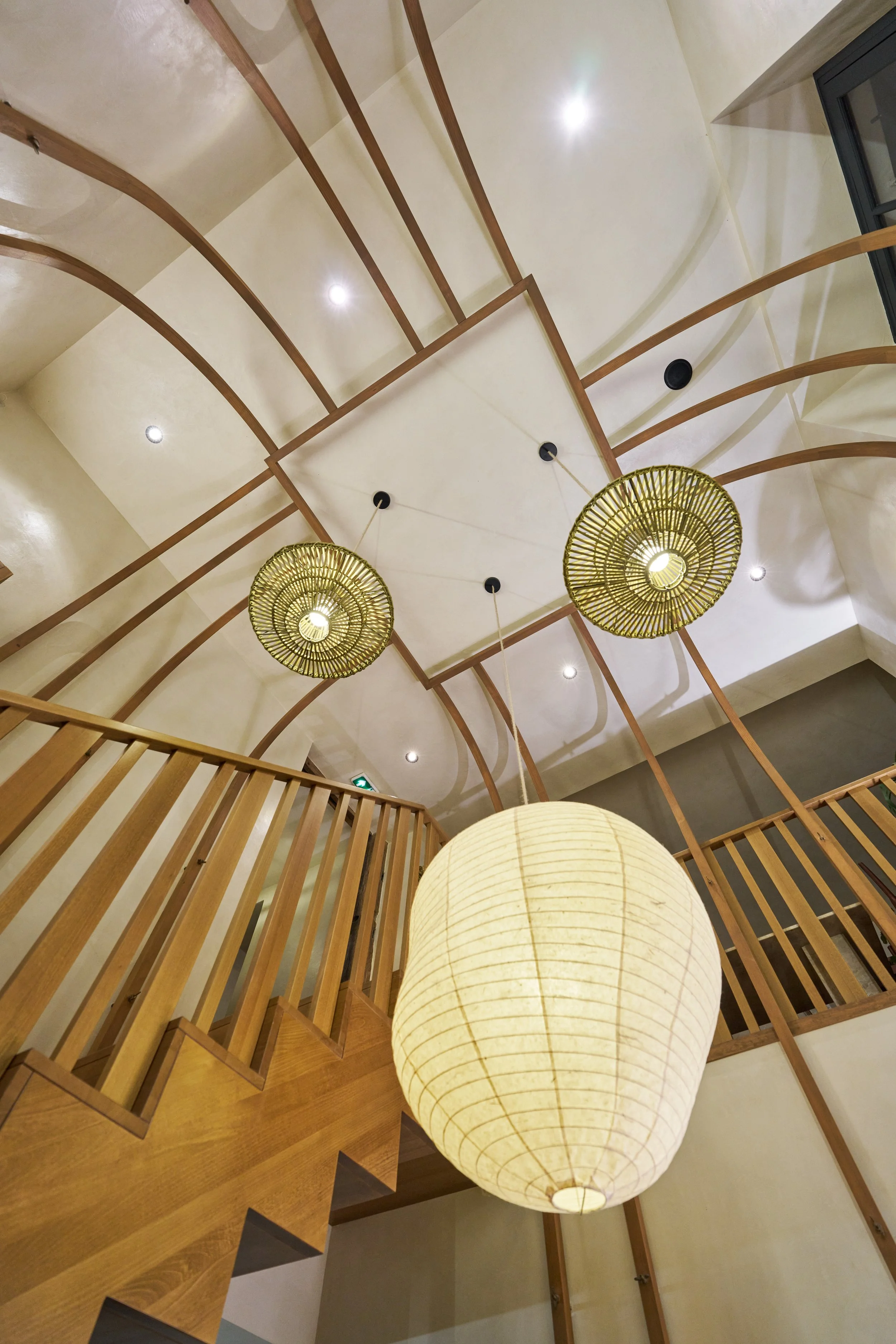 Le mobilier et les luminaires ont été majoritairement chinés, à l'exception de la suspension en papier signée Ferm Living, qui semble flotter avec légèreté au centre de la structure en bois.