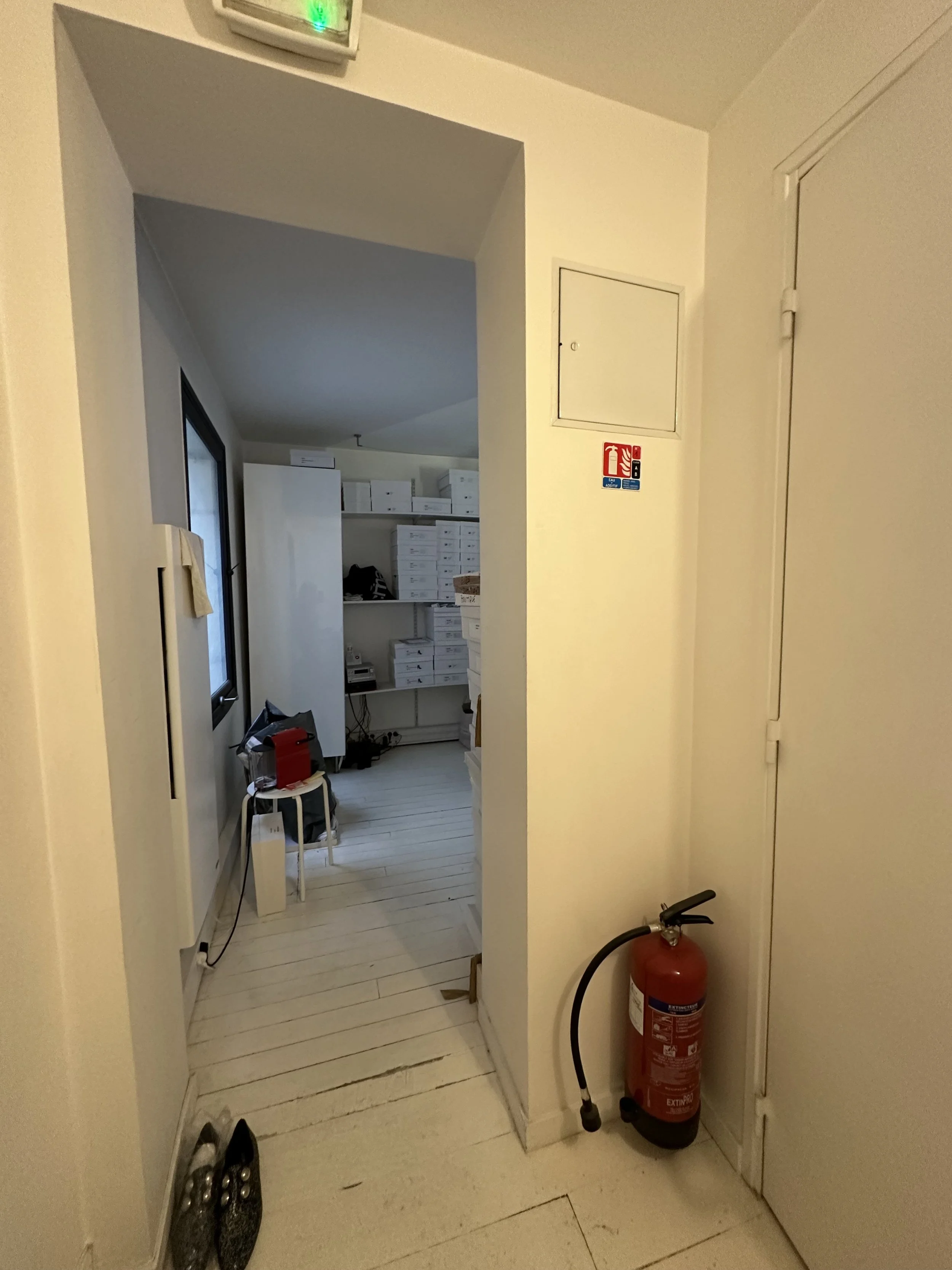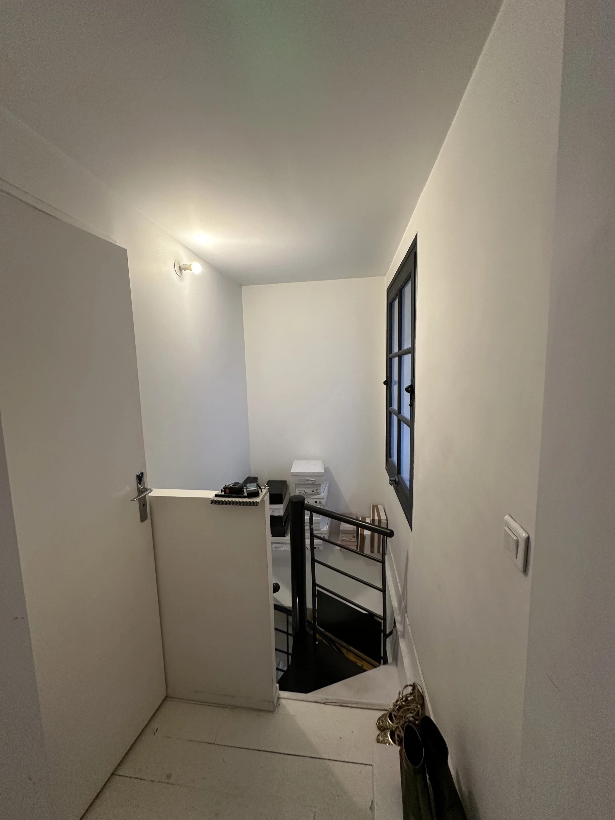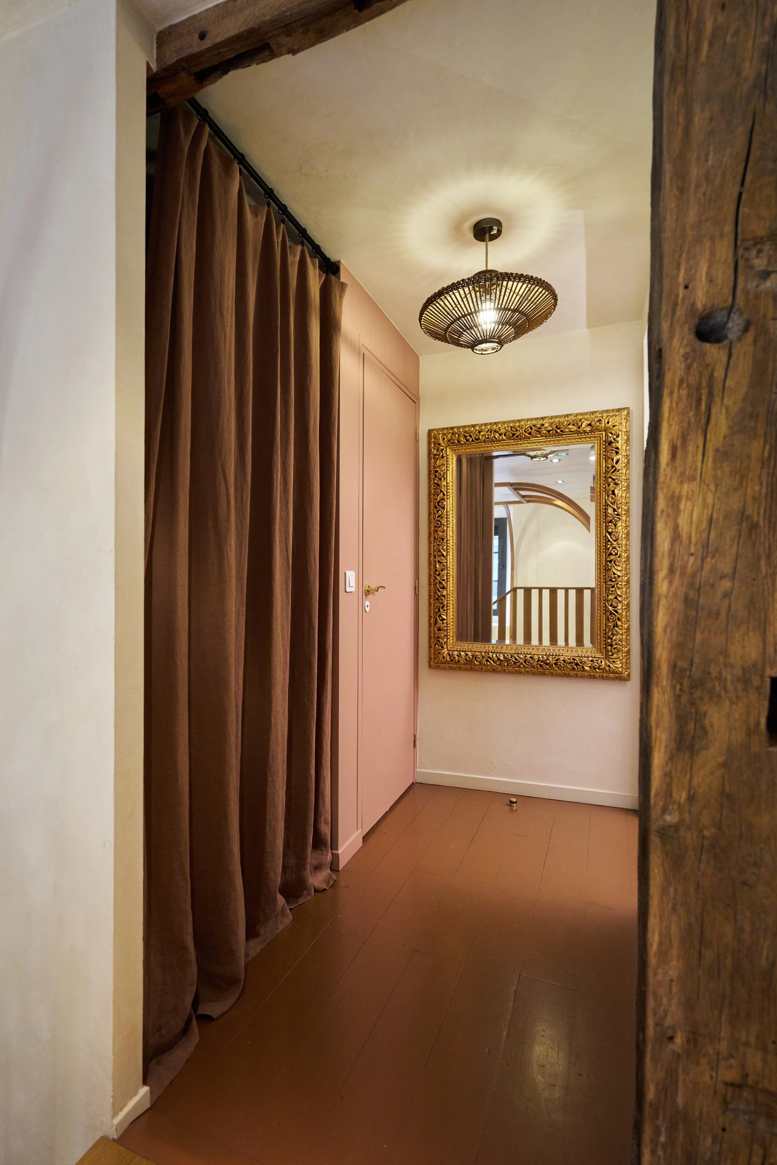 À l'étage, les cloisons existantes ont été entièrement déposées et redistribuées, offrant plus d’espace et une meilleure circulation. Une nouvelle surface de plancher a été ajoutée à l'emplacement de l'ancien escalier de la réserve pour y aménager des toilettes et une cabine d'essayage. Le parquet existant, déjà peint, a été repeint dans une teinte rappelant la terre cuite du sol du rez-de-chaussée, assurant une continuité visuelle harmonieuse.