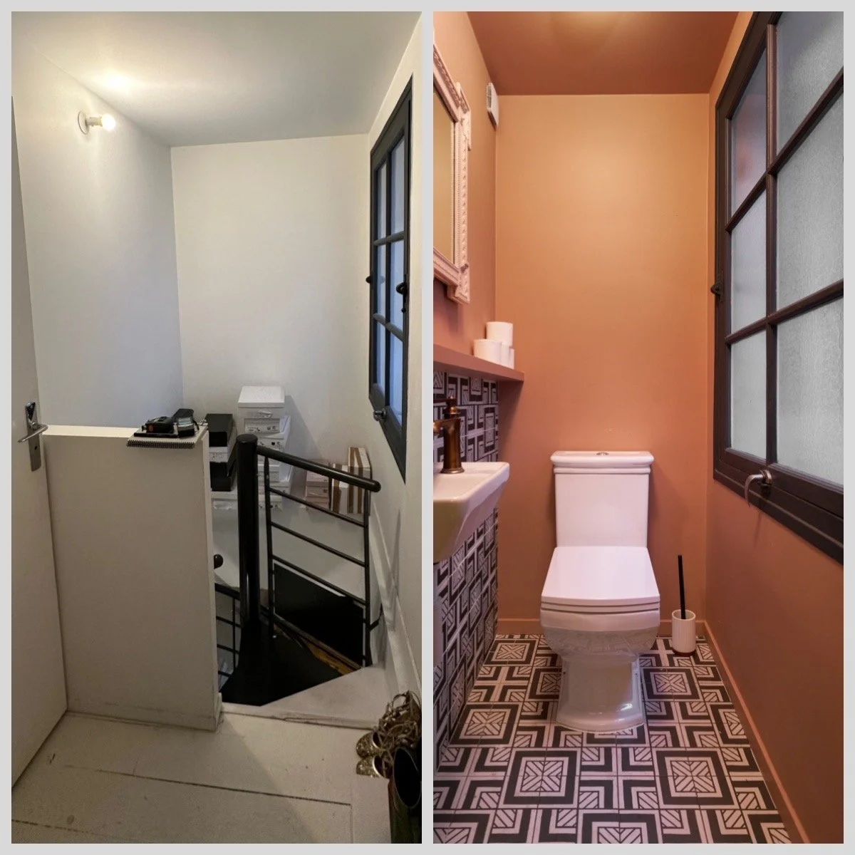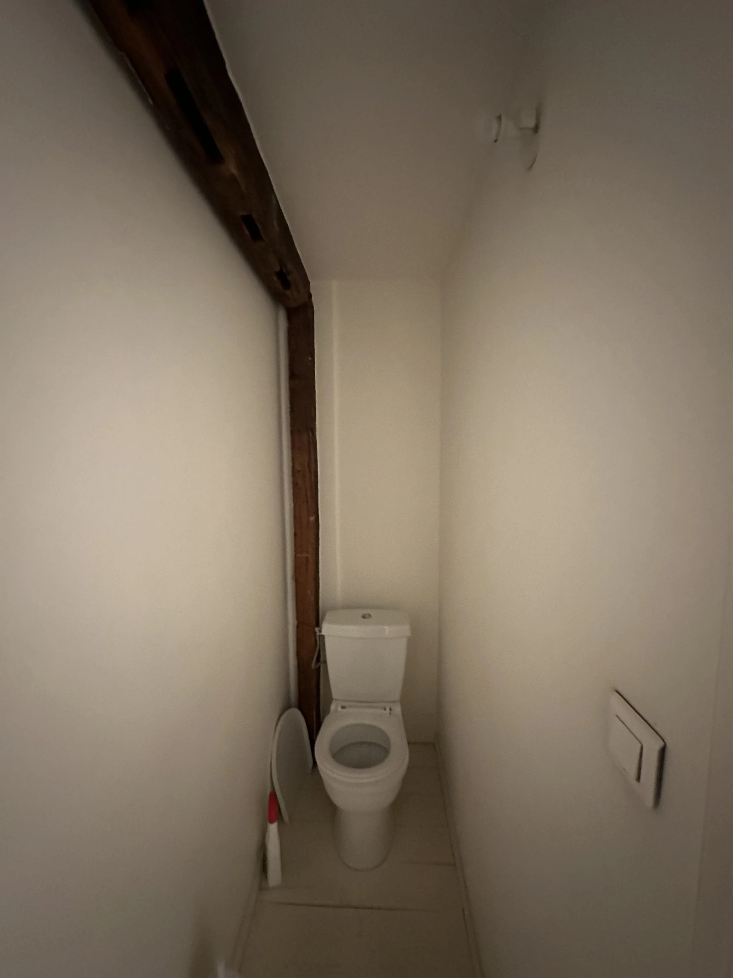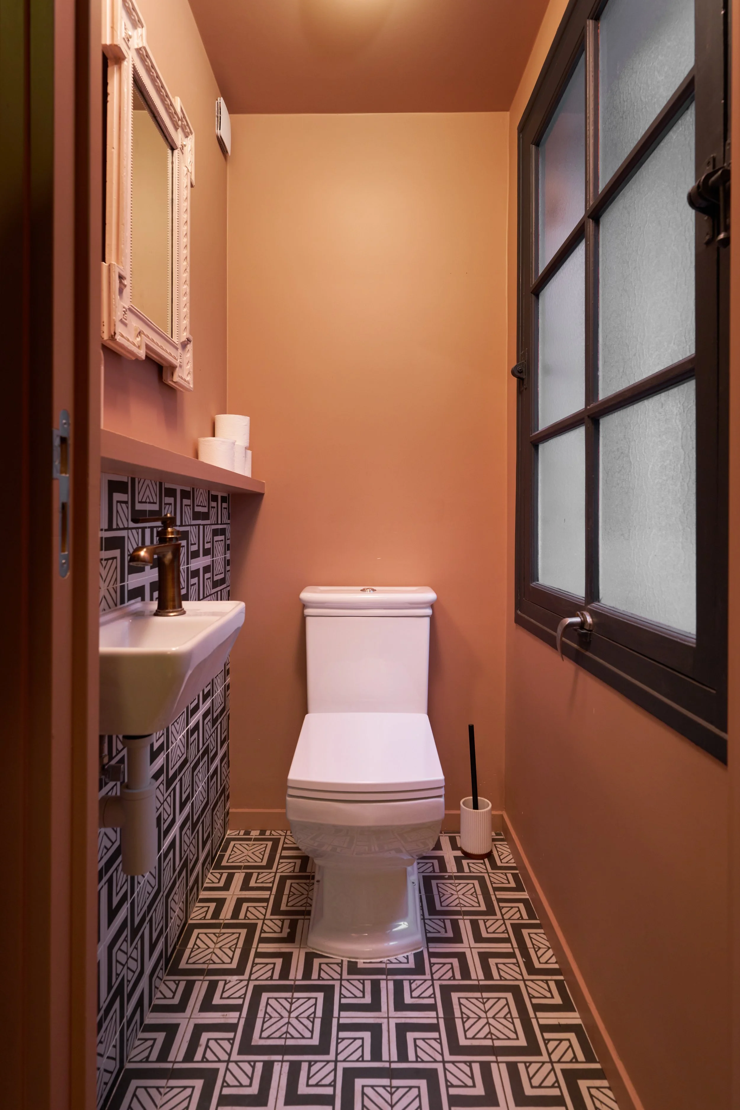 À l'étage, les cloisons existantes ont été entièrement déposées et redistribuées, offrant plus d’espace et une meilleure circulation. Une nouvelle surface de plancher a été ajoutée à l'emplacement de l'ancien escalier de la réserve pour y aménager des toilettes et une cabine d'essayage. Le parquet existant, déjà peint, a été repeint dans une teinte rappelant la terre cuite du sol du rez-de-chaussée, assurant une continuité visuelle harmonieuse.